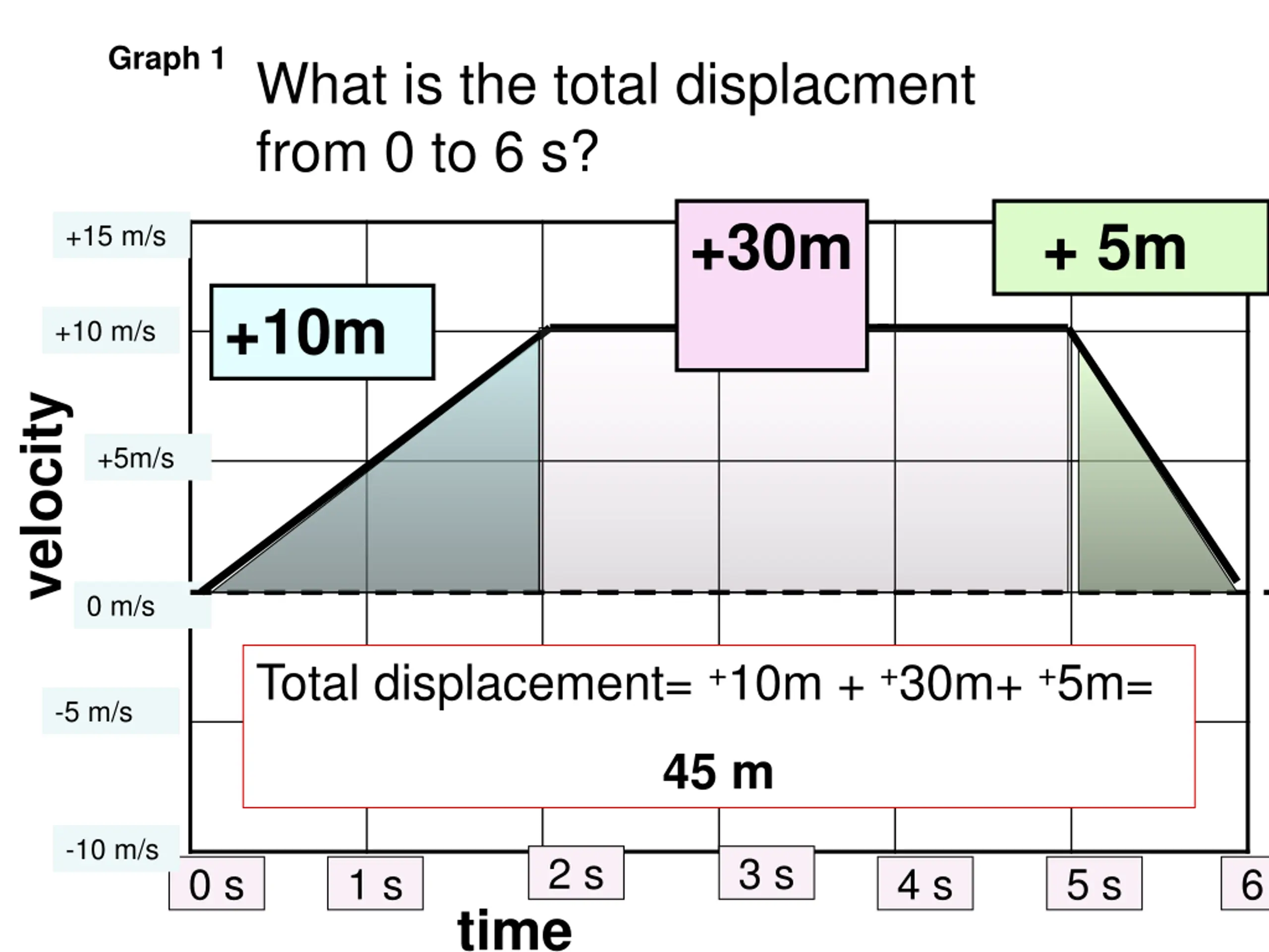 Graph 1What is the total displacement from 0 to 6 s? Imagine the shapes from the curve to the 0m/s line +15 m/s +10 m/s velocity +5m/s 0 m/s -5 m/s -10 m/s 2 s 3 s 0 s 1 s 4 s 5 s 6 s time