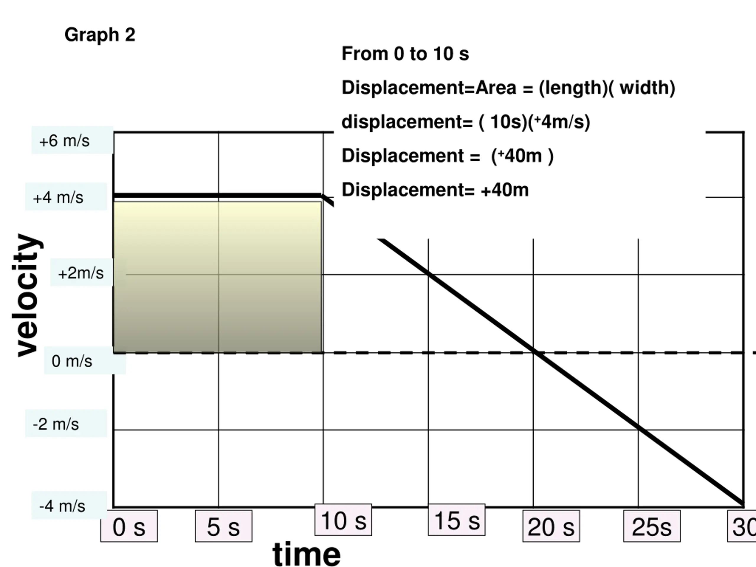 Graph 2 From 0 to 10 s Displacement=Area = (length)( width) displacement= ( 10s)(+4m/s) +6 m/s Displacement = (+40m ) Displacement= +40m +4 m/s velocity +2m/s 0 m/s -2 m/s -4 m/s 10 s 15 s 0 s 5 s 20 s 25s 30 s time