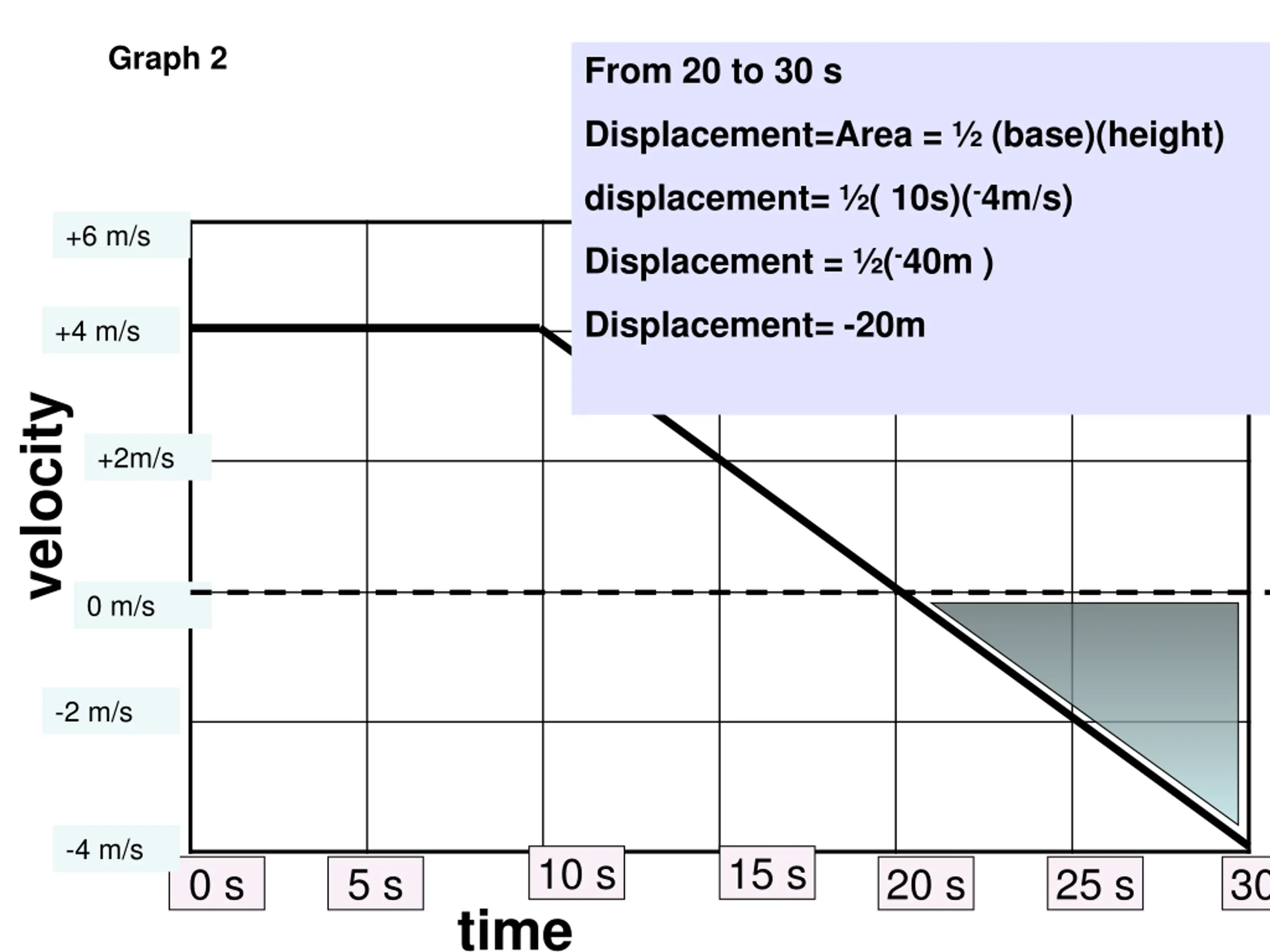 Graph 2 From 20 to 30 s Displacement=Area = (base)(height) displacement= ( 10s)(-4m/s) +6 m/s Displacement = (-40m ) Displacement= -20m +4 m/s velocity +2m/s 0 m/s -2 m/s -4 m/s 10 s 15 s 0 s 5 s 20 s 25 s 30 s time