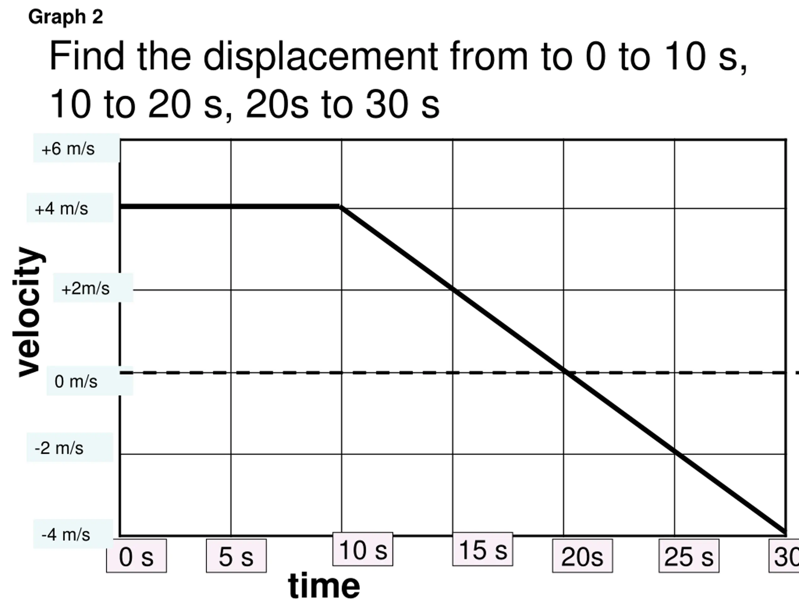 Graph 2 Find the displacement from to 0 to 10 s, 10 to 20 s, 20s to 30 s Imagine the shapes from the curve to the 0m/s line +6 m/s +4 m/s velocity +2m/s 0 m/s -2 m/s -4 m/s 10 s 15 s 0 s 5 s 20 s 25 s 30 s time