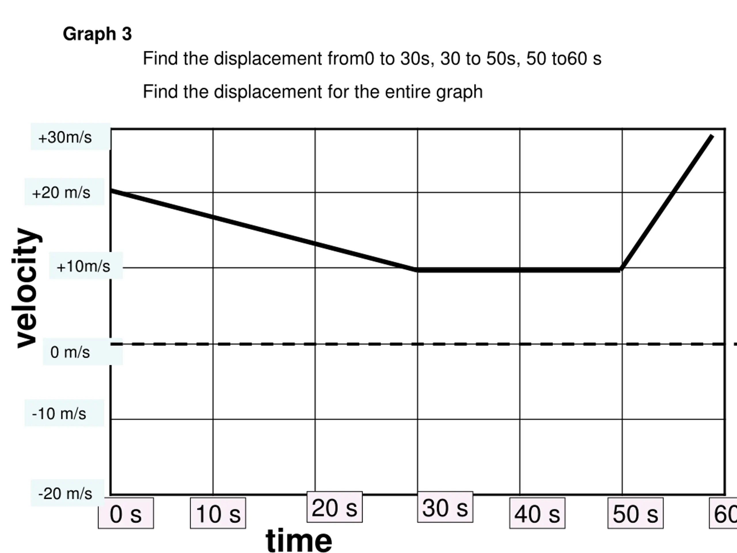 Graph 3 Find the displacement from0 to 30s, 30 to 50s, 50 to60 s Find the displacement for the entire graph +30m/s +20 m/s velocity +10m/s 0 m/s -10 m/s -20 m/s 20 s 30 s 0 s 10 s 40 s 50 s 60 s time