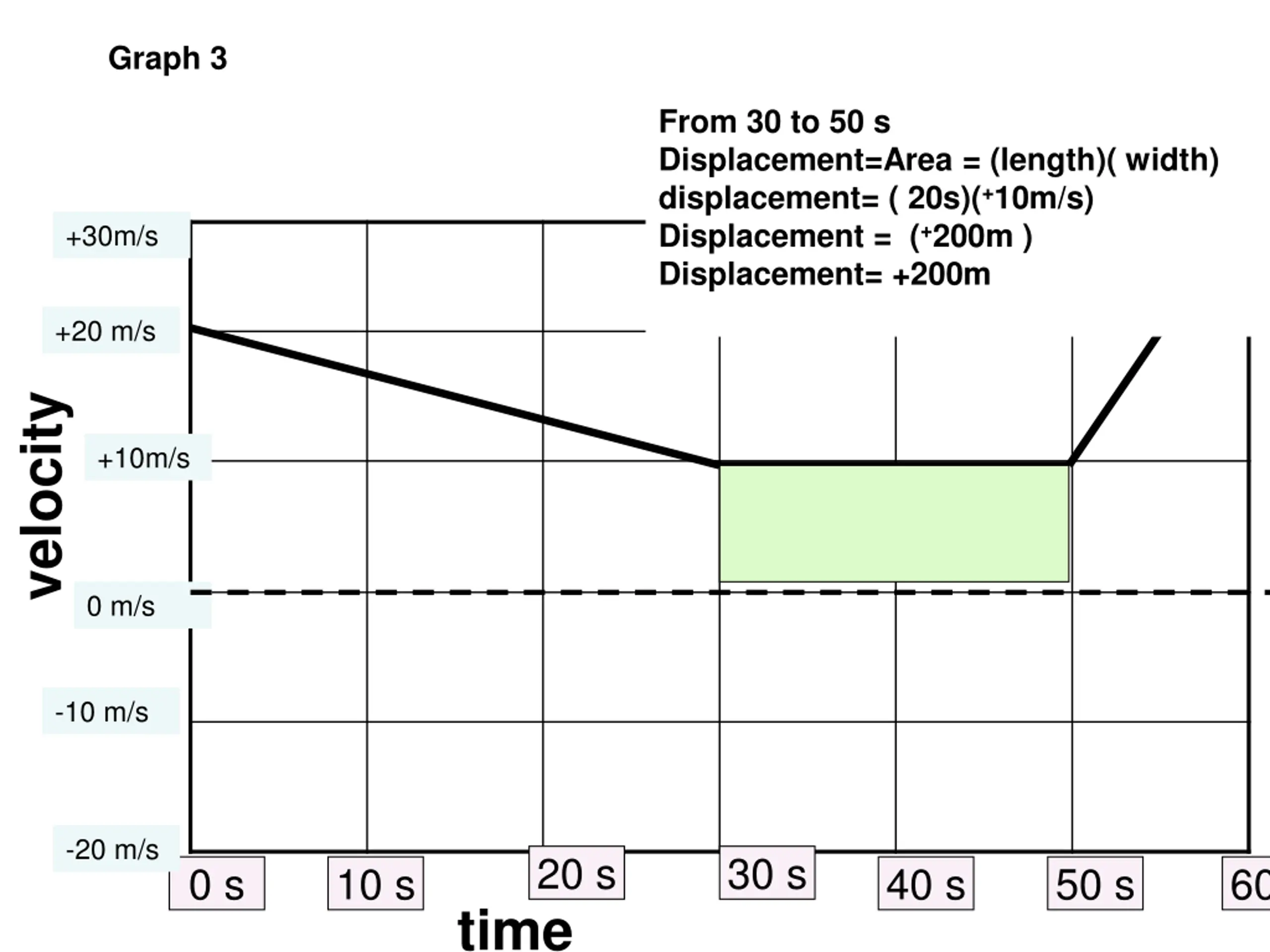 Graph 3 From 30 to 50 s Displacement=Area = (length)( width) displacement= ( 20s)(+10m/s) Displacement = (+200m ) Displacement= +200m +30m/s +20 m/s velocity +10m/s 0 m/s -10 m/s -20 m/s 20 s 30 s 0 s 10 s 40 s 50 s 60 s time