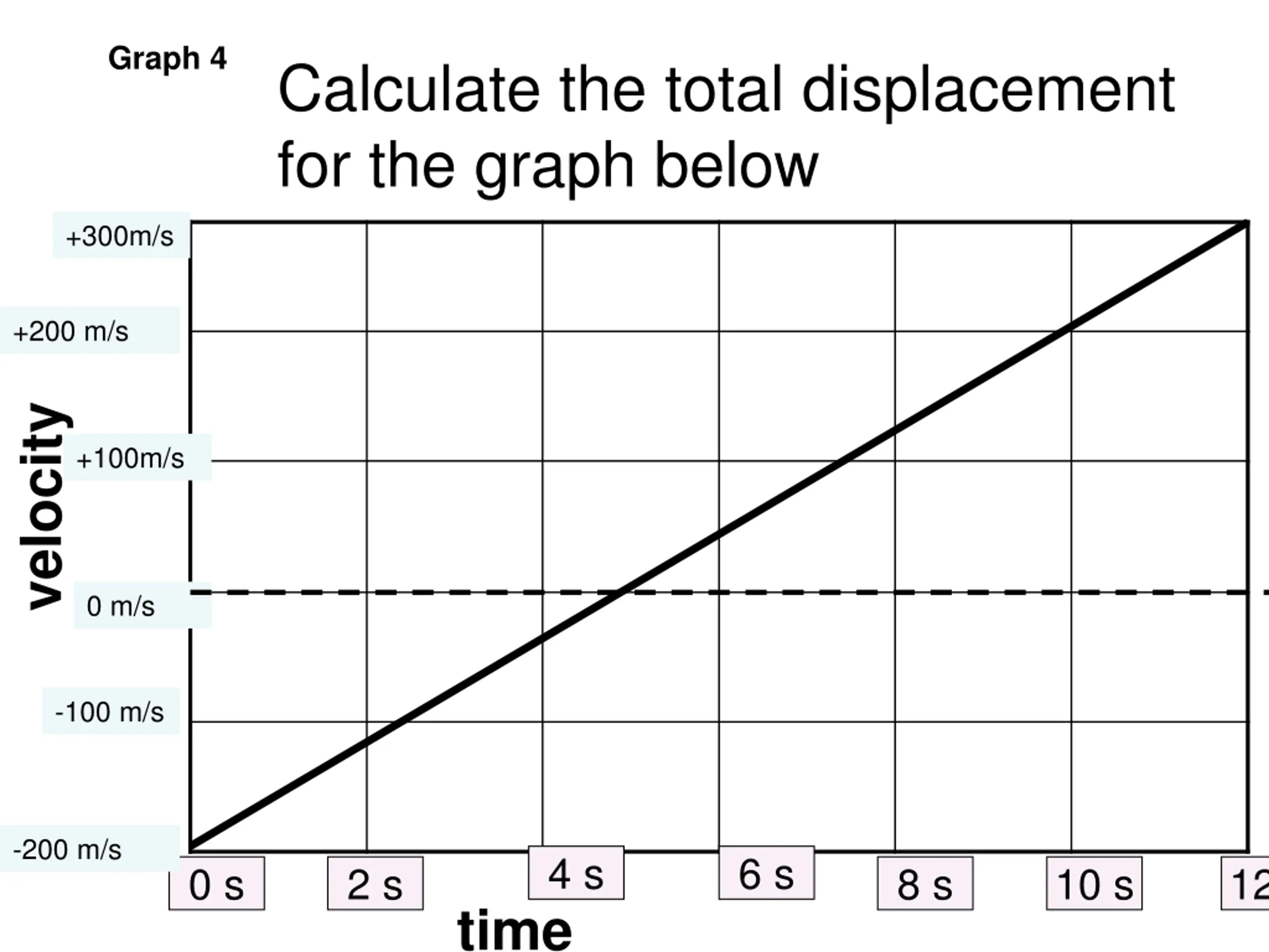 Graph 4 Calculate the total displacement for the graph below +300m/s +200 m/s velocity +100m/s 0 m/s -100 m/s -200 m/s 4 s 6 s 0 s 2 s 8 s 10 s 12 s time