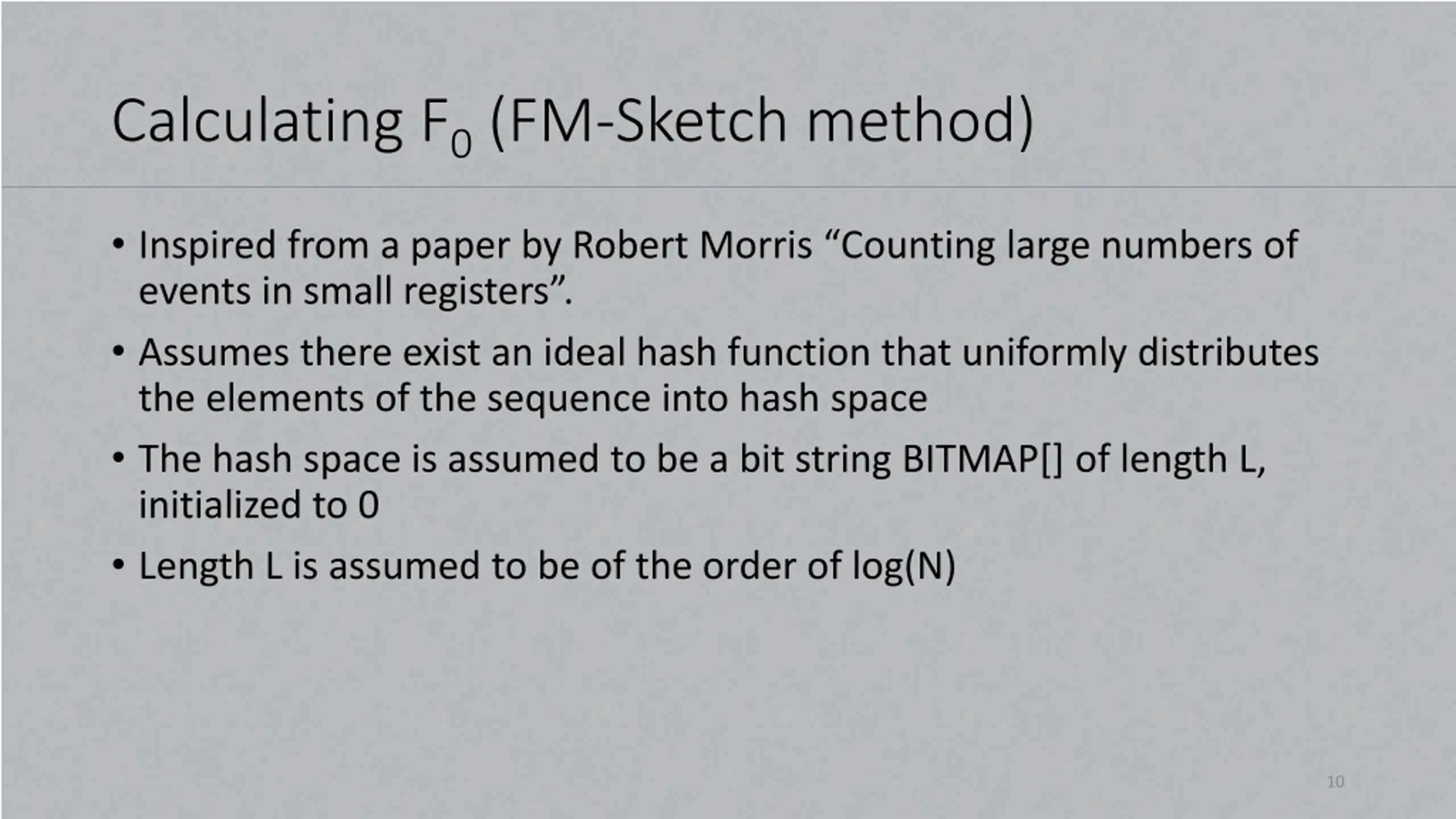 Calculating F0 (FM-Sketch method) Inspired from a paper by Robert Morris Counting large numbers of events in small registers . Assumes there exist an ideal hash function that uniformly distributes the elements of the sequence into hash space The hash space is assumed to be a bit string BITMAP[] of length L, initialized to 0 Length L is assumed to be of the order of log(N) 10