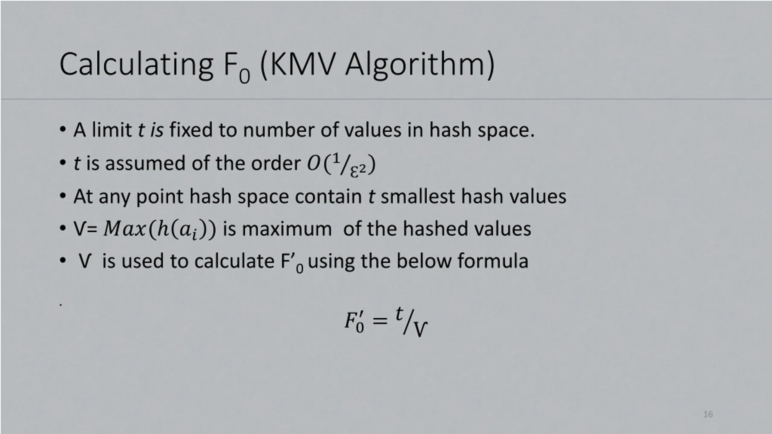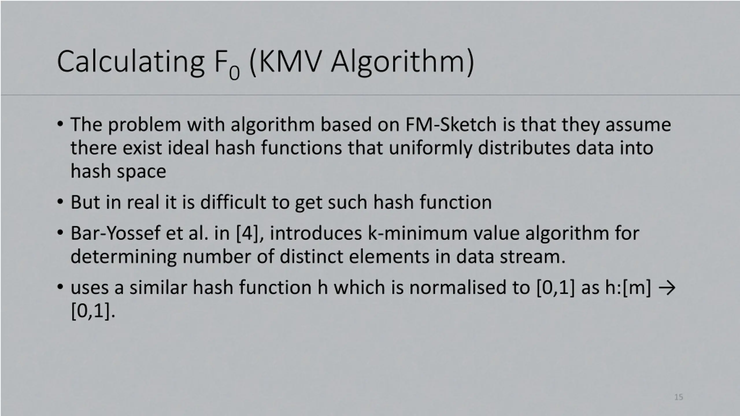 Calculating F0 (KMV Algorithm) The problem with algorithm based on FM-Sketch is that they assume there exist ideal hash functions that uniformly distributes data into hash space But in real it is difficult to get such hash function Bar-Yossef et al. in [4], introduces k-minimum value algorithm for determining number of distinct elements in data stream. uses a similar hash function h which is normalised to [0,1] as h:[m] [0,1]. 15