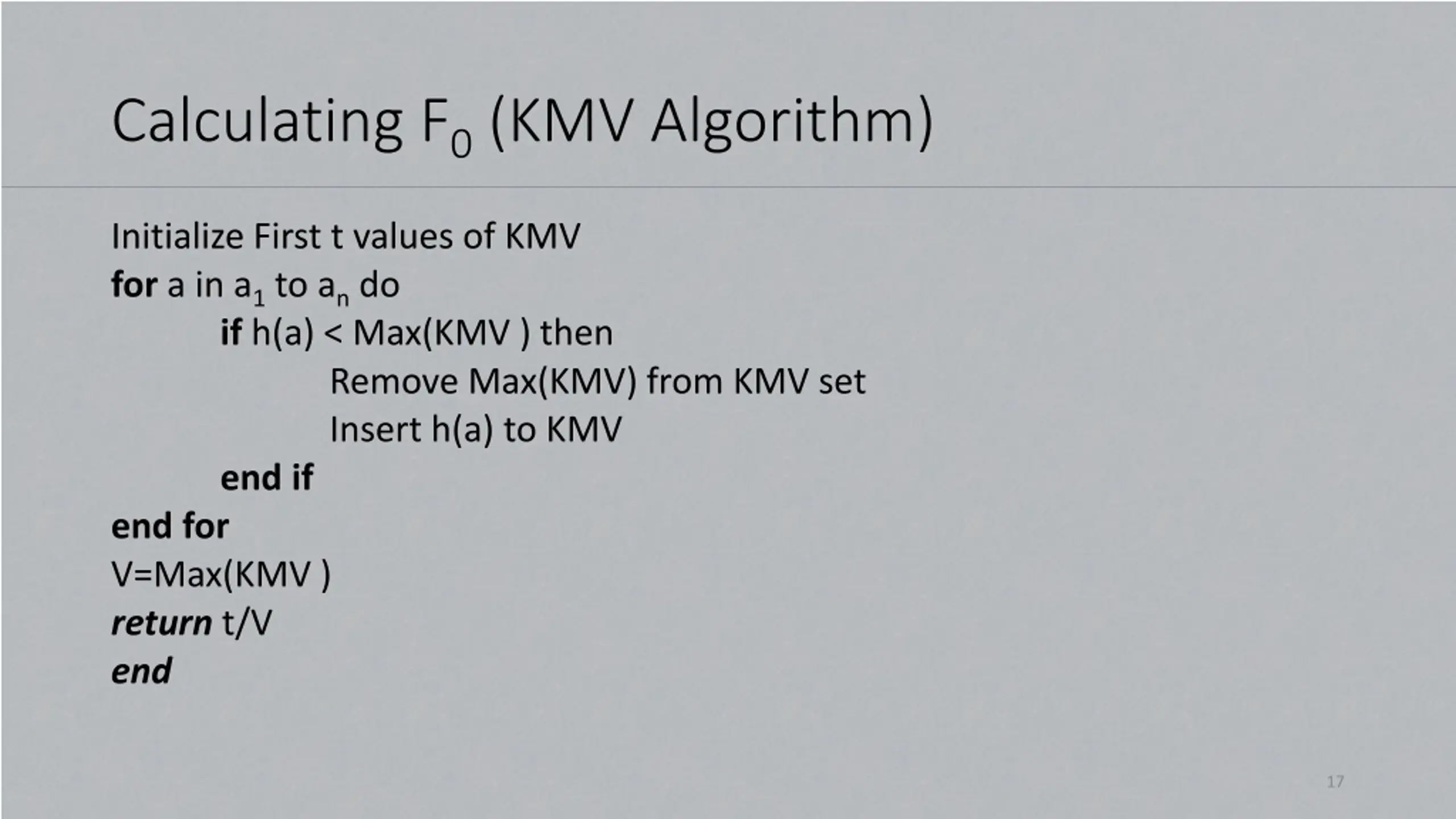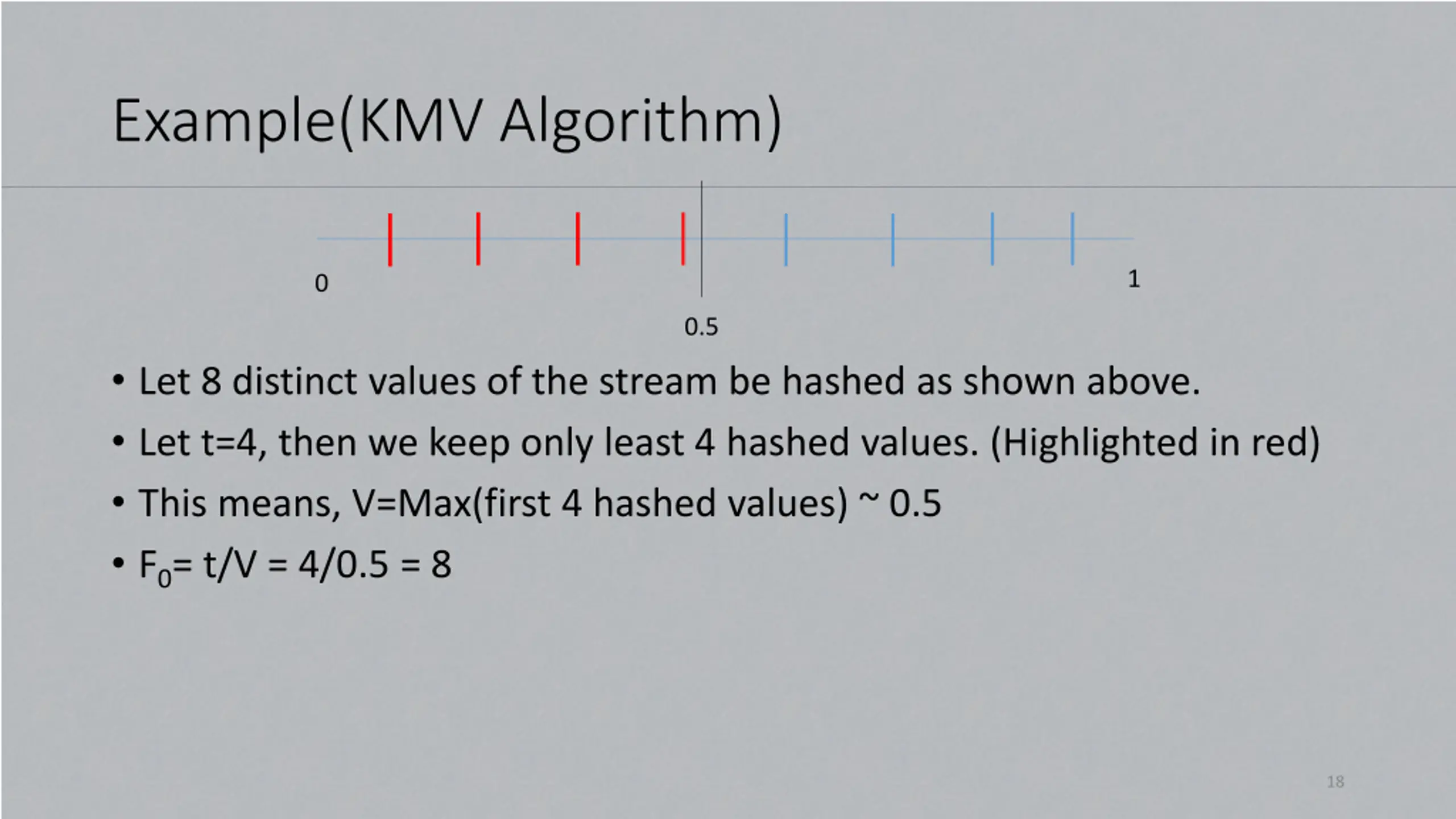 Calculating F0 (KMV Algorithm) Initialize First t values of KMV for a in a1 to an do if h(a) < Max(KMV ) then Remove Max(KMV) from KMV set Insert h(a) to KMV end if end for V=Max(KMV ) return t/V end 17