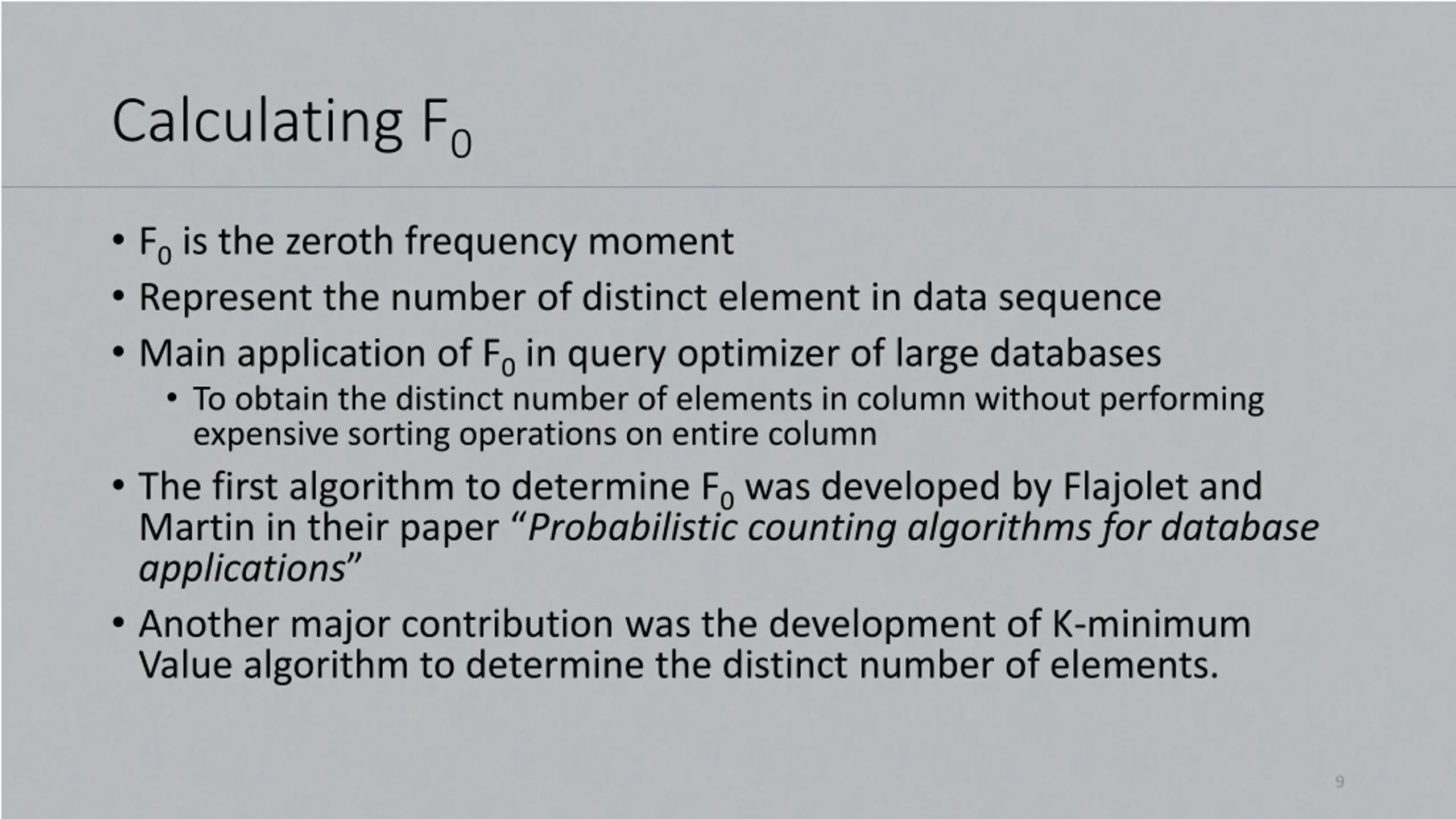 Calculating F0 F0 is the zeroth frequency moment Represent the number of distinct element in data sequence Main application of F0 in query optimizer of large databases To obtain the distinct number of elements in column without performing expensive sorting operations on entire column The first algorithm to determine F0 was developed by Flajolet and Martin in their paper Probabilistic counting algorithms for database applications Another major contribution was the development of K-minimum Value algorithm to determine the distinct number of elements. 9