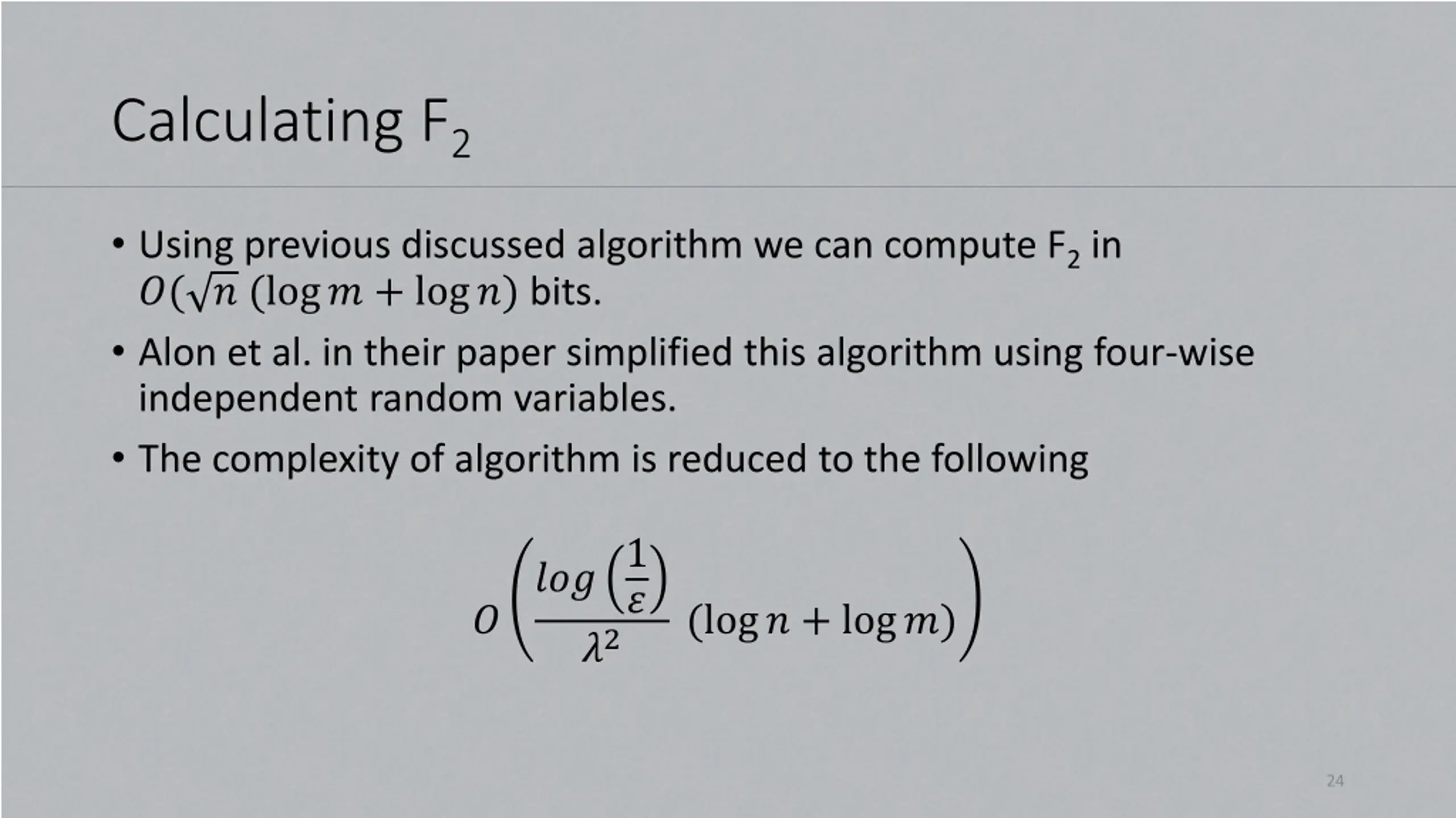Calculating F2 Using previous discussed algorithm we can compute F2 in ?( ? (log? + log?) bits. Alon et al. in their paper simplified this algorithm using four-wise independent random variables. The complexity of algorithm is reduced to the following ???1 ? ? (log? + log?) ?2 24