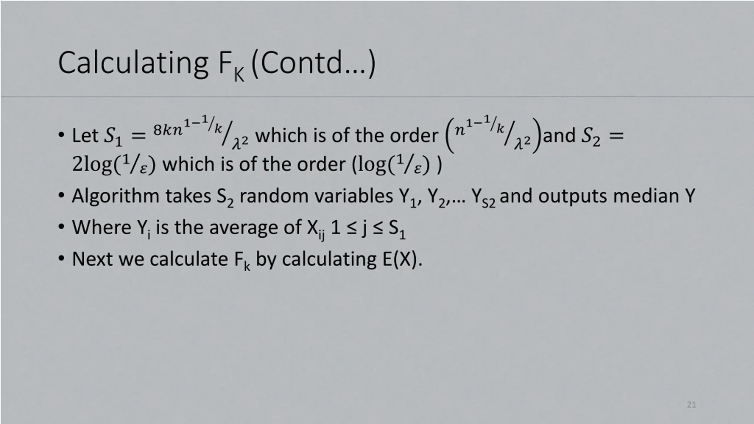 Calculating FK (Contd) 1? 1? 8??1 ?1 Let ?1= 2log( Algorithm takes S2 random variables Y1, Y2, YS2 and outputs median Y Where Yi is the average of Xij1 j S1 Next we calculate Fk by calculating E(X). ?2 and ?2= ?2 which is of the order 1?) which is of the order (log( 1?) ) 21