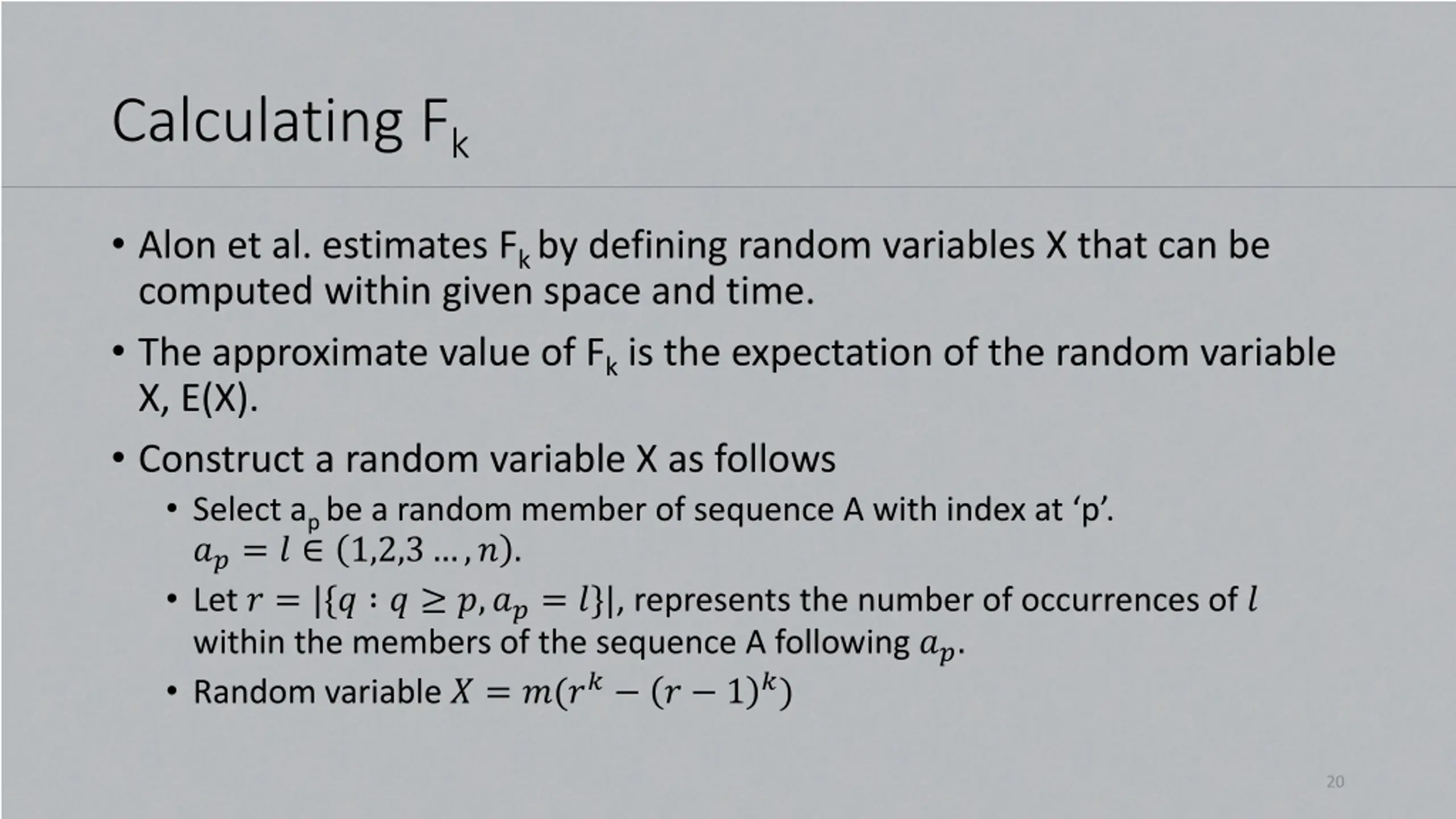 Calculating Fk Alon et al. estimates Fk by defining random variables X that can be computed within given space and time. The approximate value of Fk is the expectation of the random variable X, E(X). Construct a random variable X as follows Select ap be a random member of sequence A with index at p . ??= ? 1,2,3 ,? . Let ? = |{? ? ?,??= ?}|, represents the number of occurrences of ? within the members of the sequence A following ??. Random variable ? = ?(?? ? 1?) 20