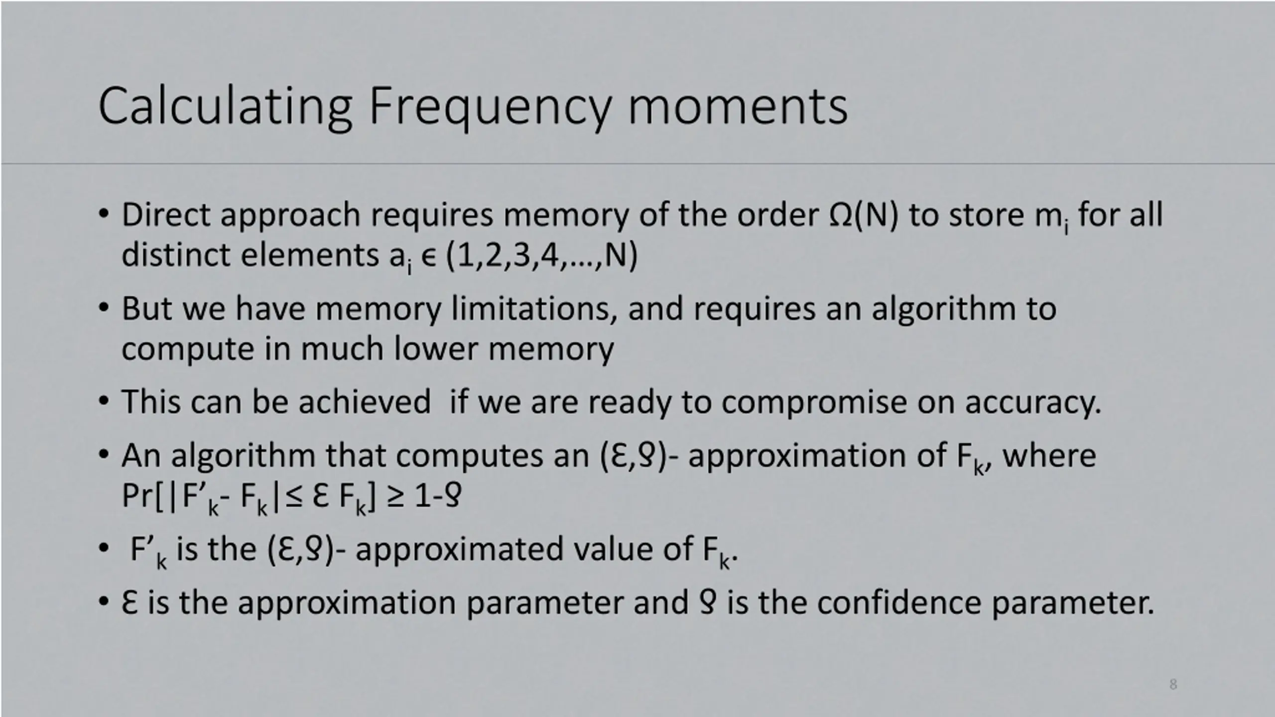 Calculating Frequency moments Direct approach requires memory of the order (N) to store mi for all distinct elements ai (1,2,3,4, ,N) But we have memory limitations, and requires an algorithm to compute in much lower memory This can be achieved if we are ready to compromise on accuracy. An algorithm that computes an ( , )- approximation of Fk, where Pr[|F k- Fk| Fk] 1- F k is the ( , )- approximated value of Fk. is the approximation parameter and is the confidence parameter. 8