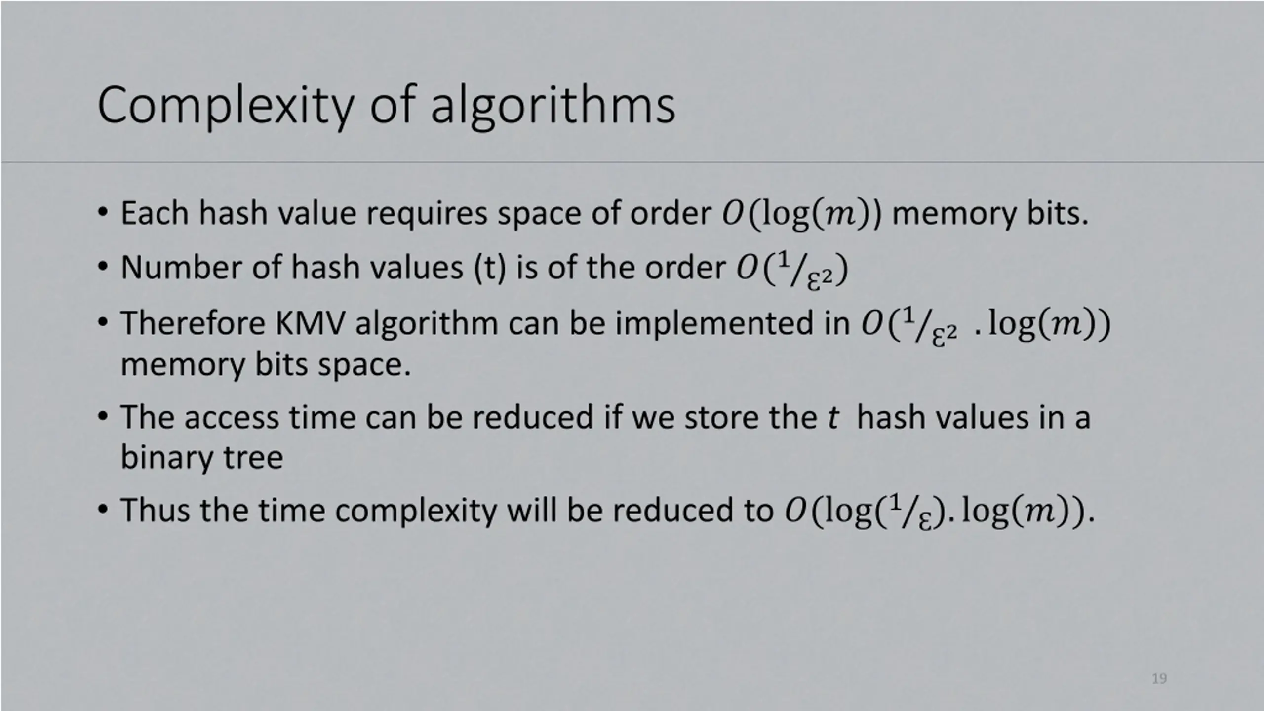 Complexity of algorithms Each hash value requires space of order ?(log ? ) memory bits. Number of hash values (t) is of the order ?( Therefore KMV algorithm can be implemented in ?( memory bits space. The access time can be reduced if we store the t hash values in a binary tree Thus the time complexity will be reduced to ?(log( 1 2) 1 2 .log ? ) 1 ).log ? ). 19