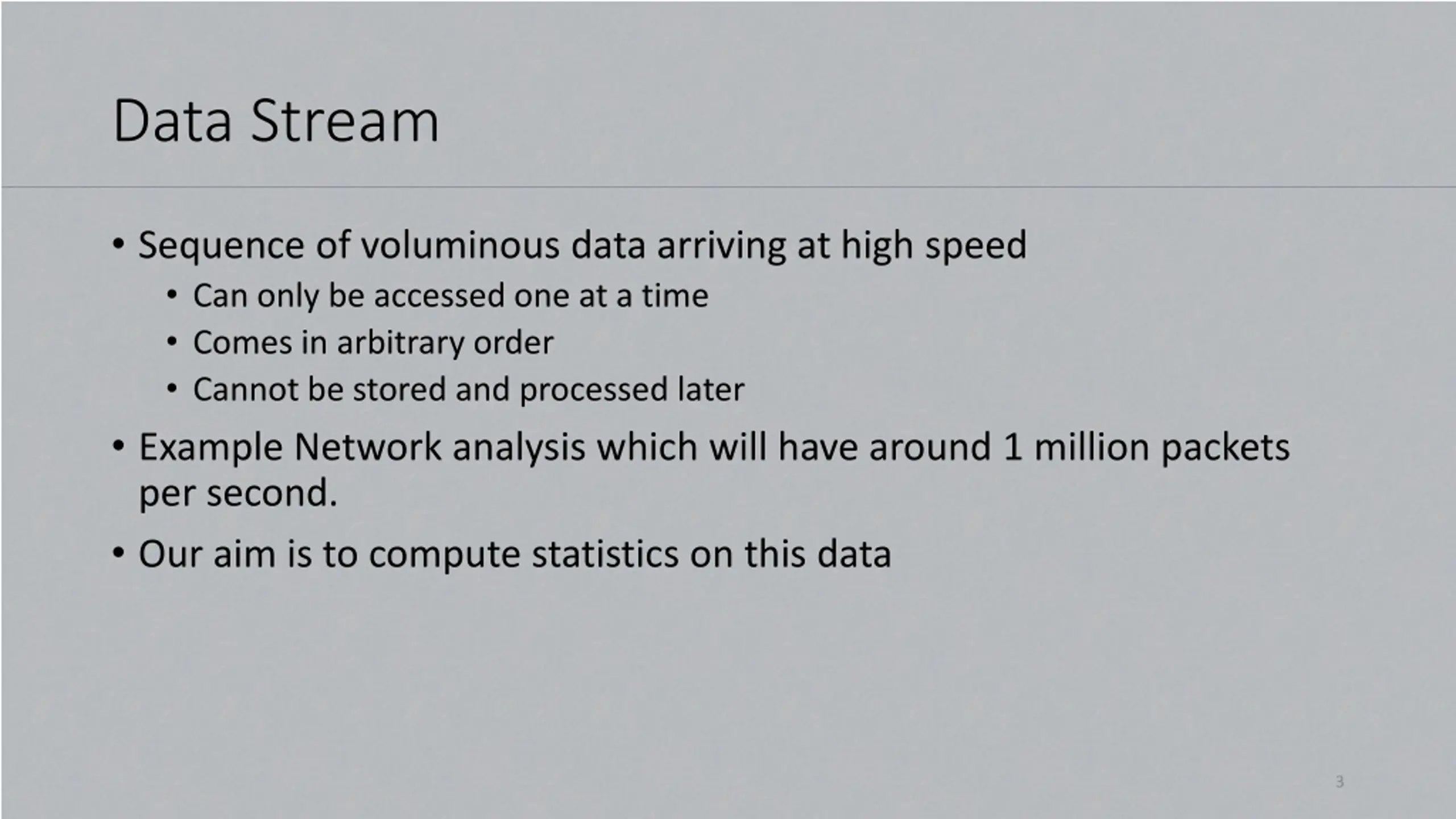 Data Stream Sequence of voluminous data arriving at high speed Can only be accessed one at a time Comes in arbitrary order Cannot be stored and processed later Example Network analysis which will have around 1 million packets per second. Our aim is to compute statistics on this data 3