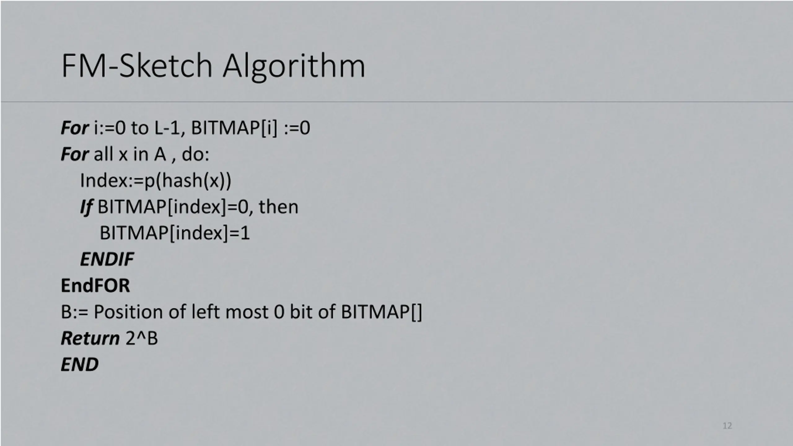 FM-Sketch Algorithm For i:=0 to L-1, BITMAP[i] :=0 For all x in A , do: Index:=p(hash(x)) If BITMAP[index]=0, then BITMAP[index]=1 ENDIF EndFOR B:= Position of left most 0 bit of BITMAP[] Return 2^B END 12