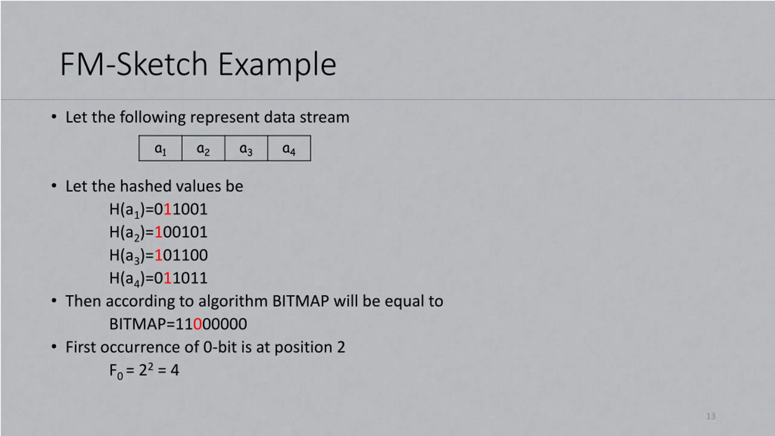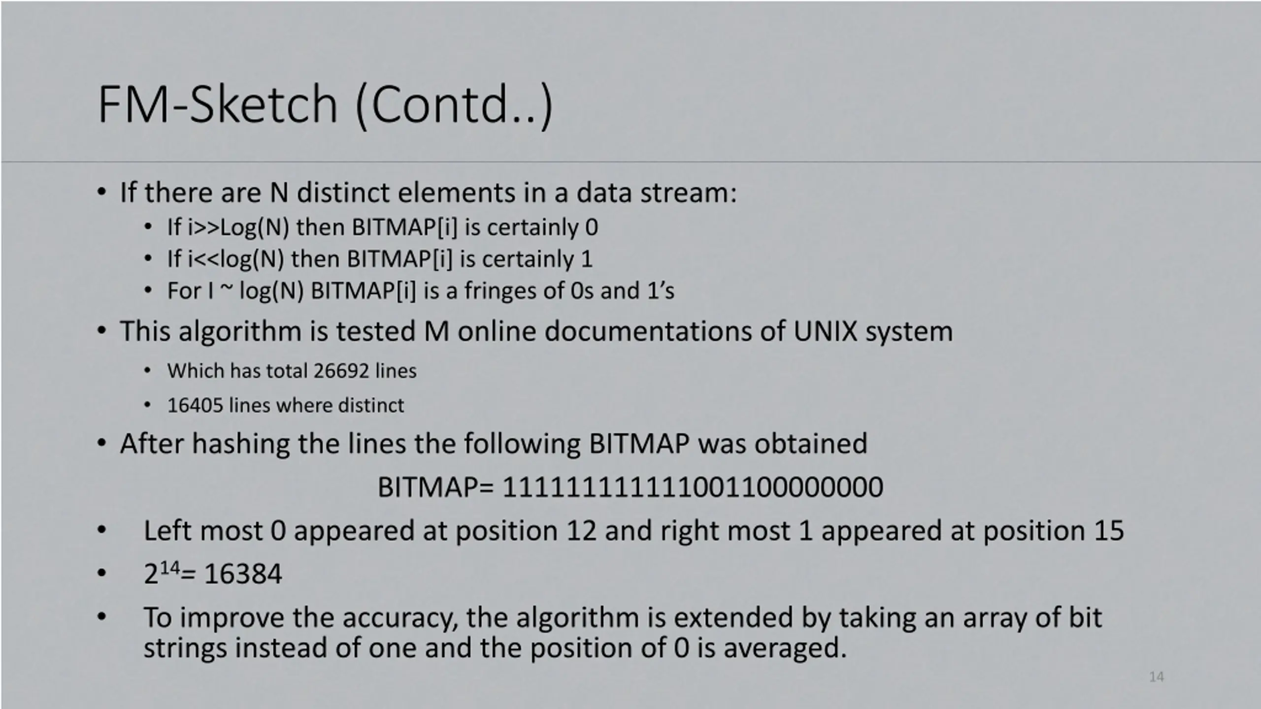 FM-Sketch Example Let the following represent data stream a1 a2 a3 a4 Let the hashed values be H(a1)=011001 H(a2)=100101 H(a3)=101100 H(a4)=011011 Then according to algorithm BITMAP will be equal to BITMAP=11000000 First occurrence of 0-bit is at position 2 F0 = 22 = 4 13