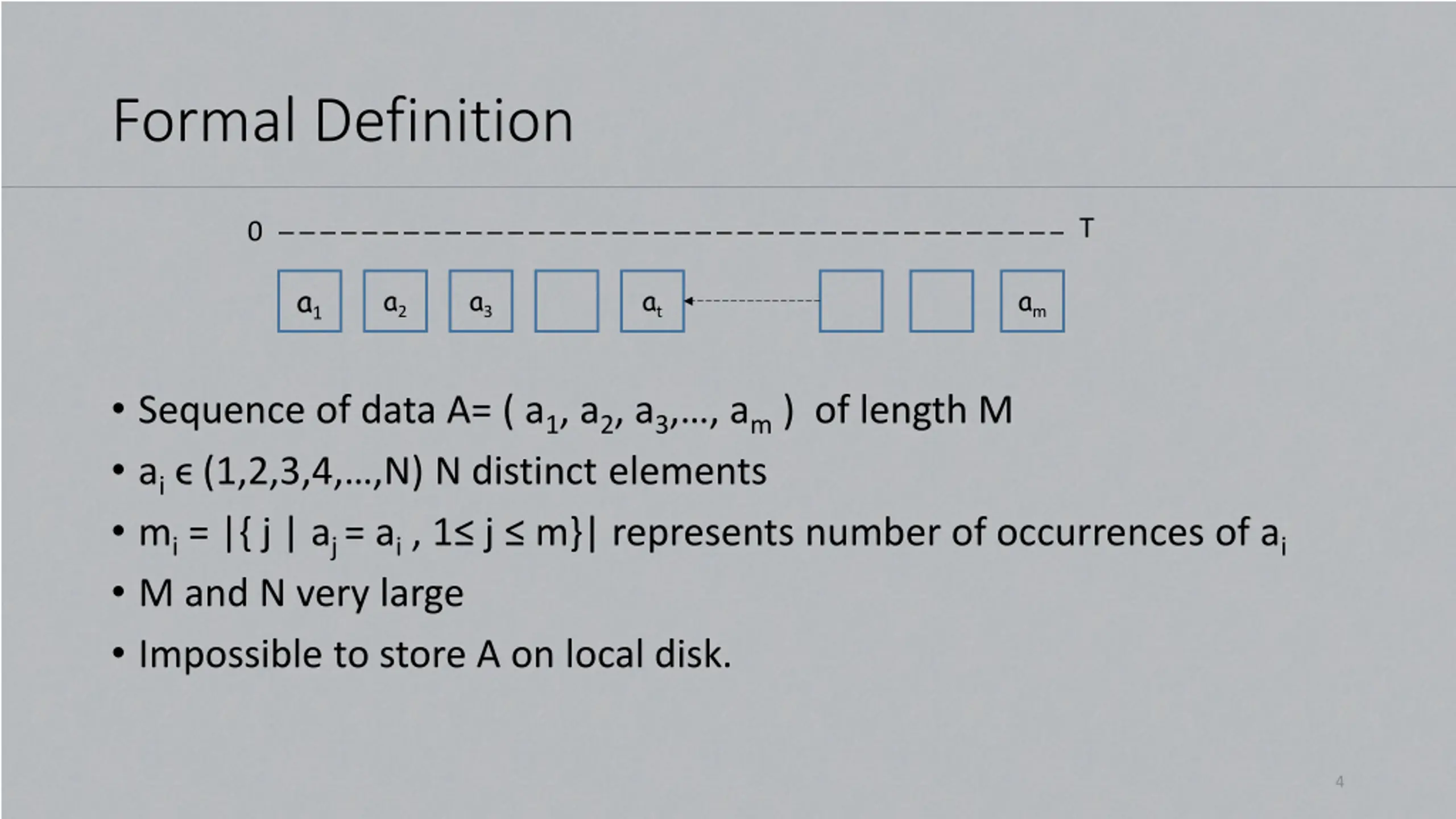 Formal Definition T 0 a1 a2 a3 at am Sequence of data A= ( a1, a2, a3, , am ) of length M ai (1,2,3,4, ,N) N distinct elements mi = |{ j | aj = ai , 1 j m}| represents number of occurrences of ai M and N very large Impossible to store A on local disk. 4