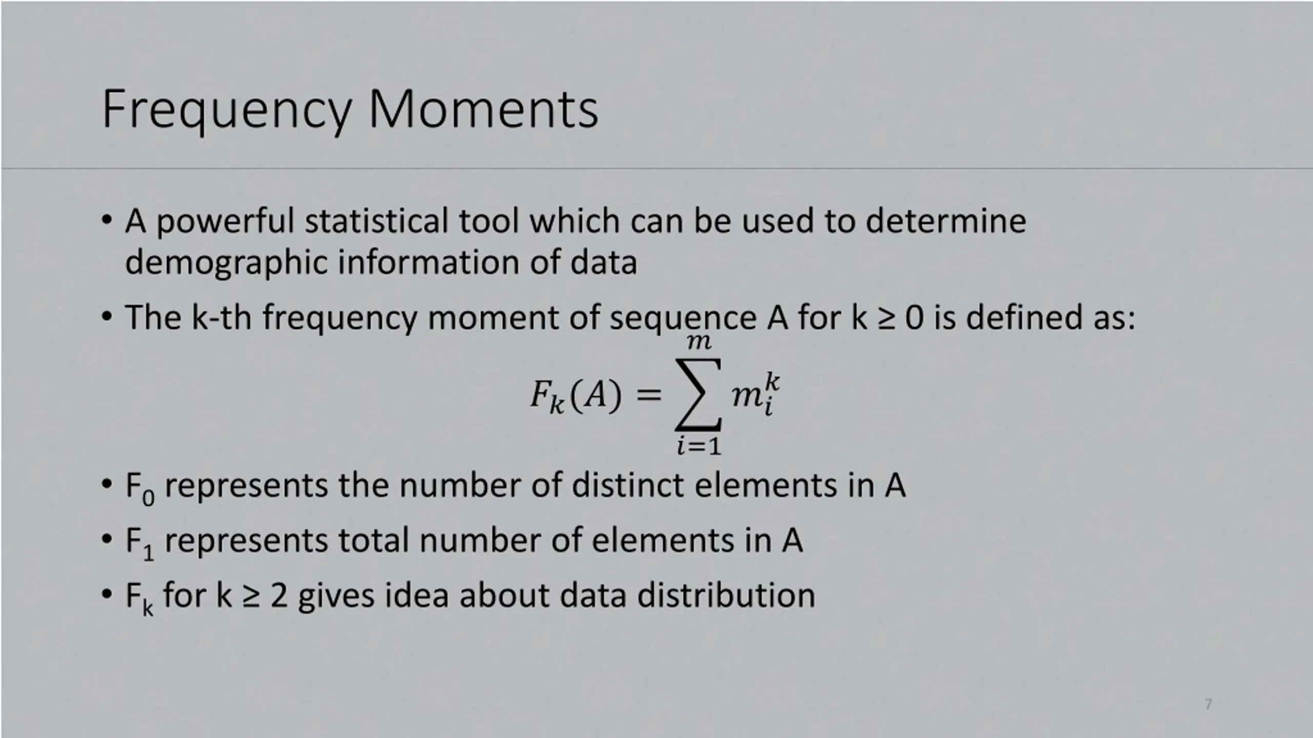 Frequency Moments A powerful statistical tool which can be used to determine demographic information of data The k-th frequency moment of sequence A for k 0 is defined as: ? ? ??(?) = ?? ?=1 F0 represents the number of distinct elements in A F1 represents total number of elements in A Fk for k 2 gives idea about data distribution 7