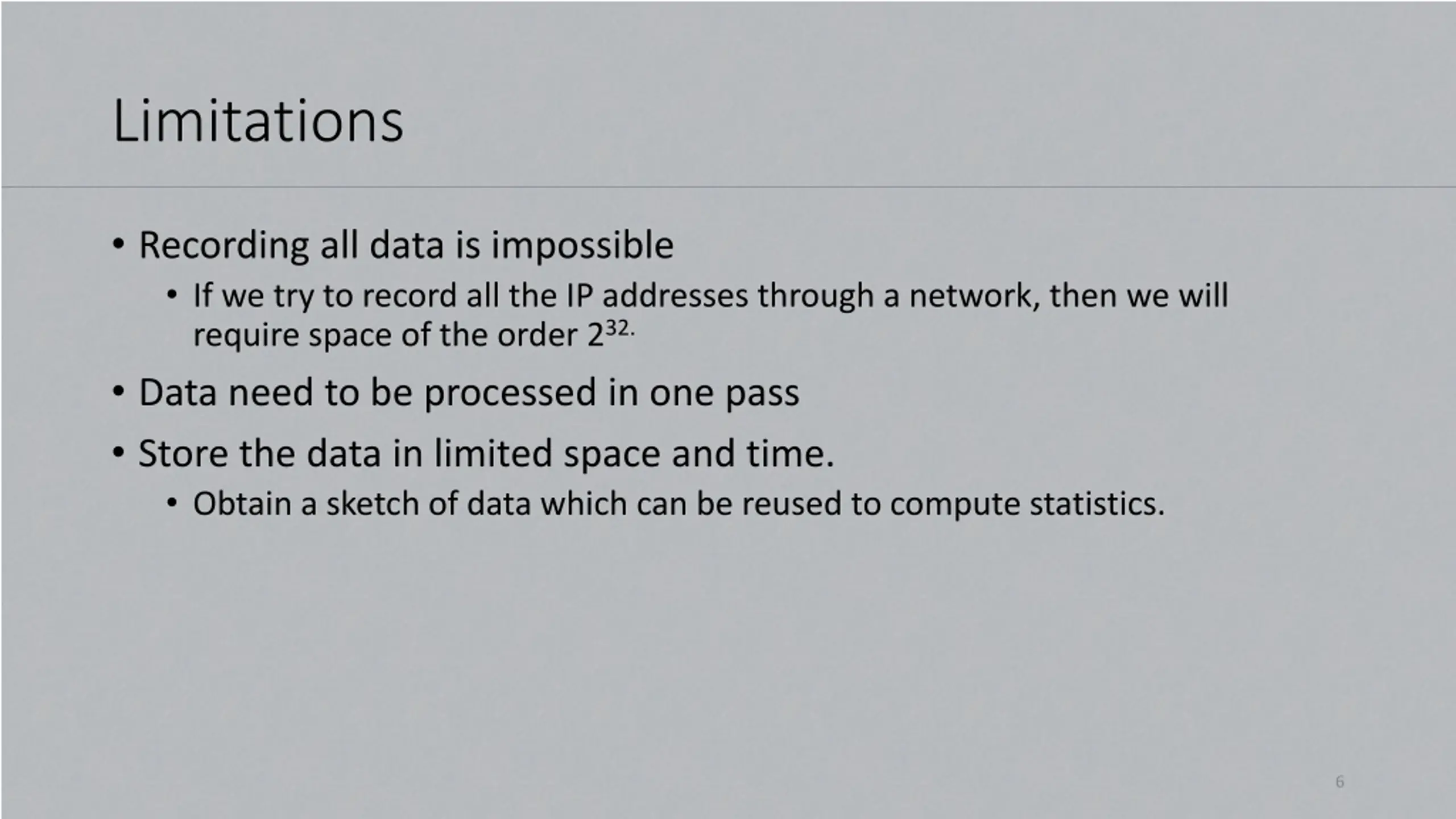 Limitations Recording all data is impossible If we try to record all the IP addresses through a network, then we will require space of the order 232. Data need to be processed in one pass Store the data in limited space and time. Obtain a sketch of data which can be reused to compute statistics. 6