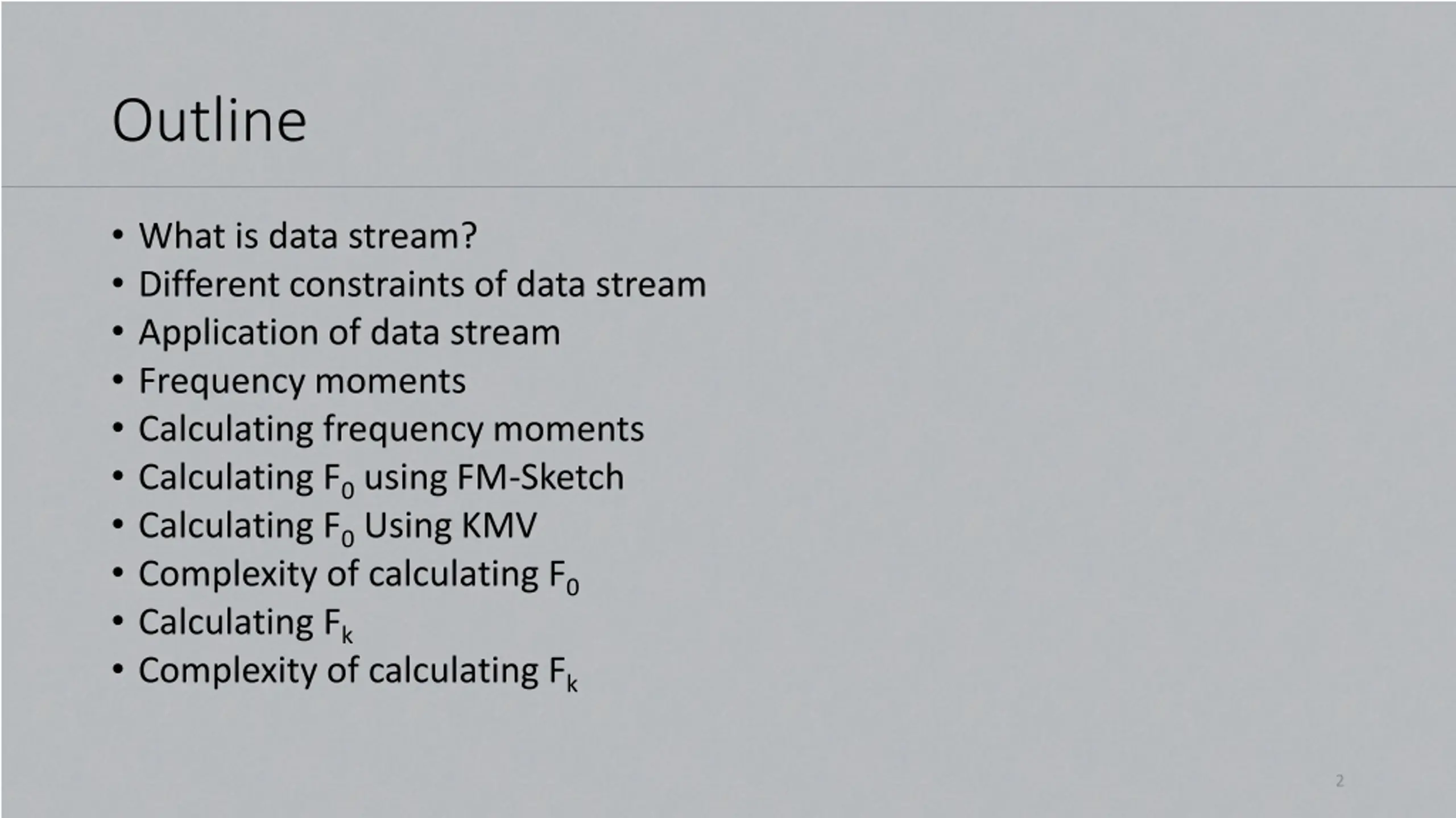 Outline What is data stream? Different constraints of data stream Application of data stream Frequency moments Calculating frequency moments Calculating F0 using FM-Sketch Calculating F0 Using KMV Complexity of calculating F0 Calculating Fk Complexity of calculating Fk 2