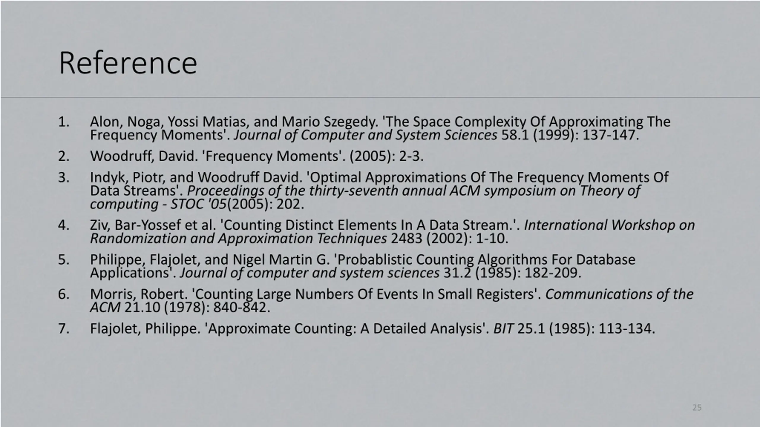 Reference 1. Alon, Noga, Yossi Matias, and Mario Szegedy. 'The Space Complexity Of Approximating The Frequency Moments'. Journal of Computer and System Sciences 58.1 (1999): 137-147. Woodruff, David. 'Frequency Moments'. (2005): 2-3. Indyk, Piotr, and Woodruff David. 'Optimal Approximations Of The Frequency Moments Of Data Streams'. Proceedings of the thirty-seventh annual ACM symposium on Theory of computing - STOC '05(2005): 202. Ziv, Bar-Yossef et al. 'Counting Distinct Elements In A Data Stream.'. International Workshop on Randomization and Approximation Techniques 2483 (2002): 1-10. Philippe, Flajolet, and Nigel Martin G. 'Probablistic Counting Algorithms For Database Applications'. Journal of computer and system sciences 31.2 (1985): 182-209. Morris, Robert. 'Counting Large Numbers Of Events In Small Registers'. Communications of the ACM 21.10 (1978): 840-842. Flajolet, Philippe. 'Approximate Counting: A Detailed Analysis'. BIT 25.1 (1985): 113-134. 2. 3. 4. 5. 6. 7. 25
