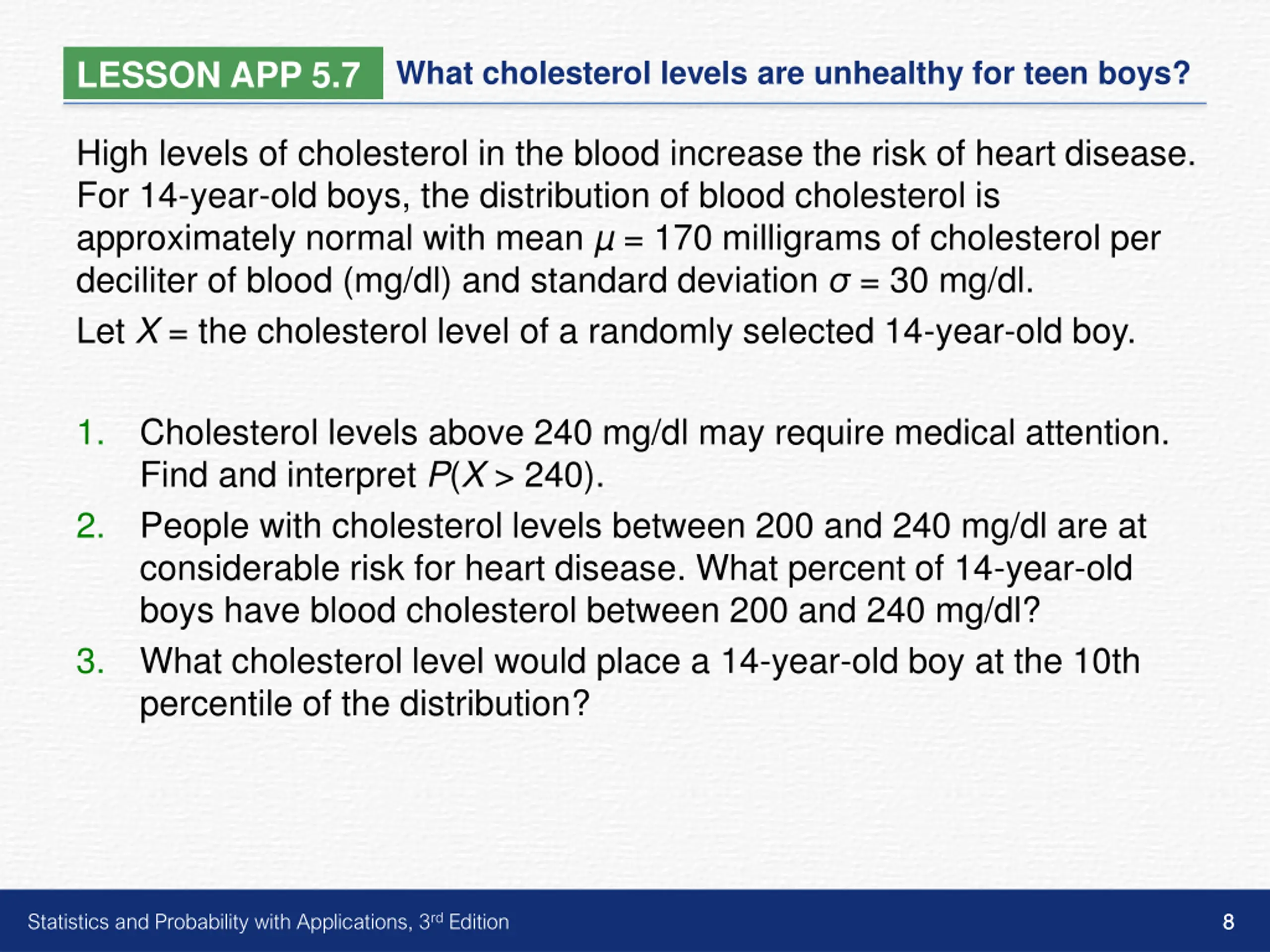 LESSON APP 5.7 What cholesterol levels are unhealthy for teen boys? High levels of cholesterol in the blood increase the risk of heart disease. For 14-year-old boys, the distribution of blood cholesterol is approximately normal with mean = 170 milligrams of cholesterol per deciliter of blood (mg/dl) and standard deviation = 30 mg/dl. Let X = the cholesterol level of a randomly selected 14-year-old boy. 1. Cholesterol levels above 240 mg/dl may require medical attention. Find and interpret P(X > 240). People with cholesterol levels between 200 and 240 mg/dl are at considerable risk for heart disease. What percent of 14-year-old boys have blood cholesterol between 200 and 240 mg/dl? What cholesterol level would place a 14-year-old boy at the 10th percentile of the distribution? 2. 3. Statistics and Probability with Applications, 3rd Edition 8 8