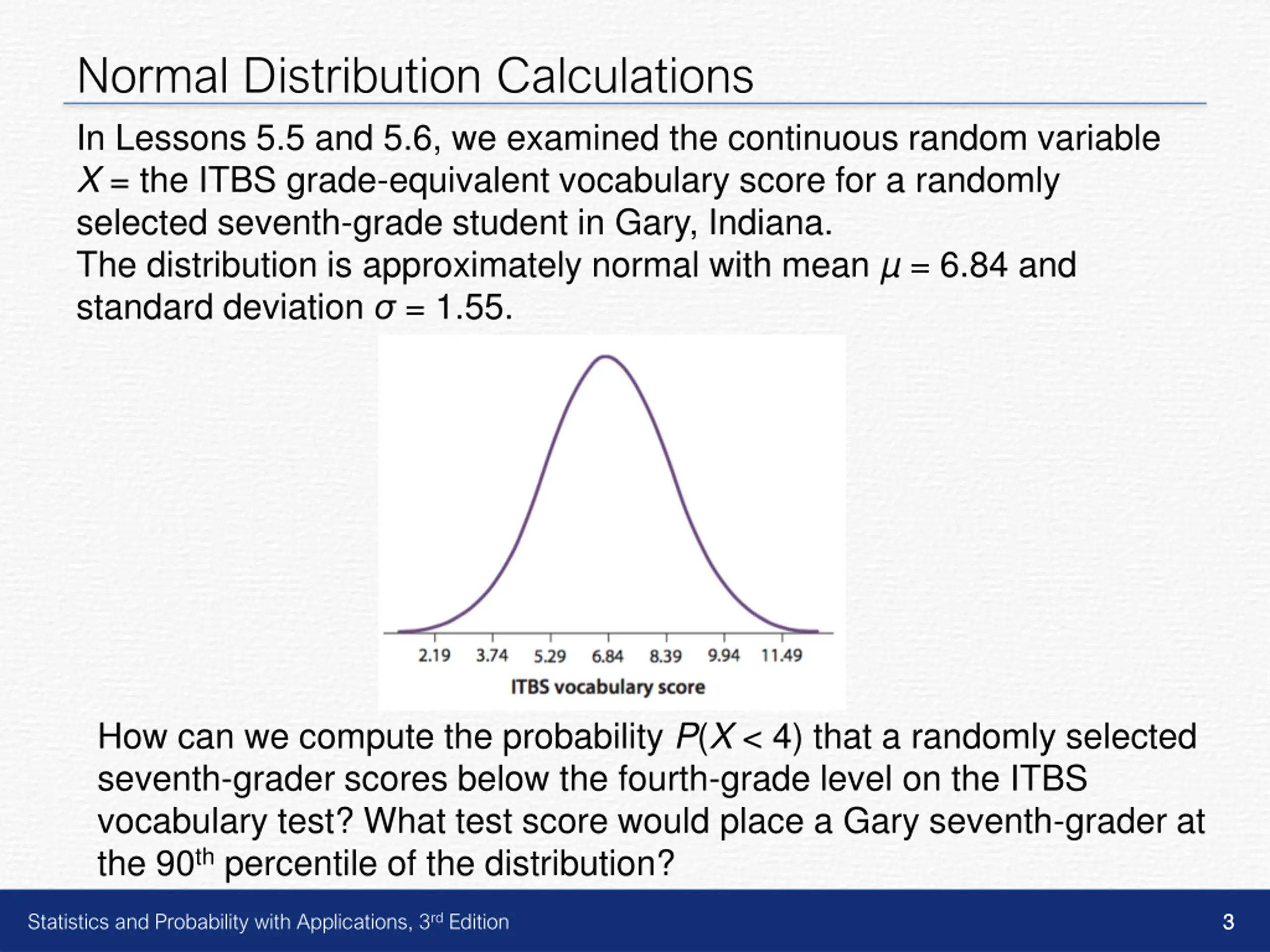 Normal Distribution Calculations In Lessons 5.5 and 5.6, we examined the continuous random variable X = the ITBS grade-equivalent vocabulary score for a randomly selected seventh-grade student in Gary, Indiana. The distribution is approximately normal with mean = 6.84 and standard deviation = 1.55. How can we compute the probability P(X < 4) that a randomly selected seventh-grader scores below the fourth-grade level on the ITBS vocabulary test? What test score would place a Gary seventh-grader at the 90th percentile of the distribution? Statistics and Probability with Applications, 3rdEdition 3 3
