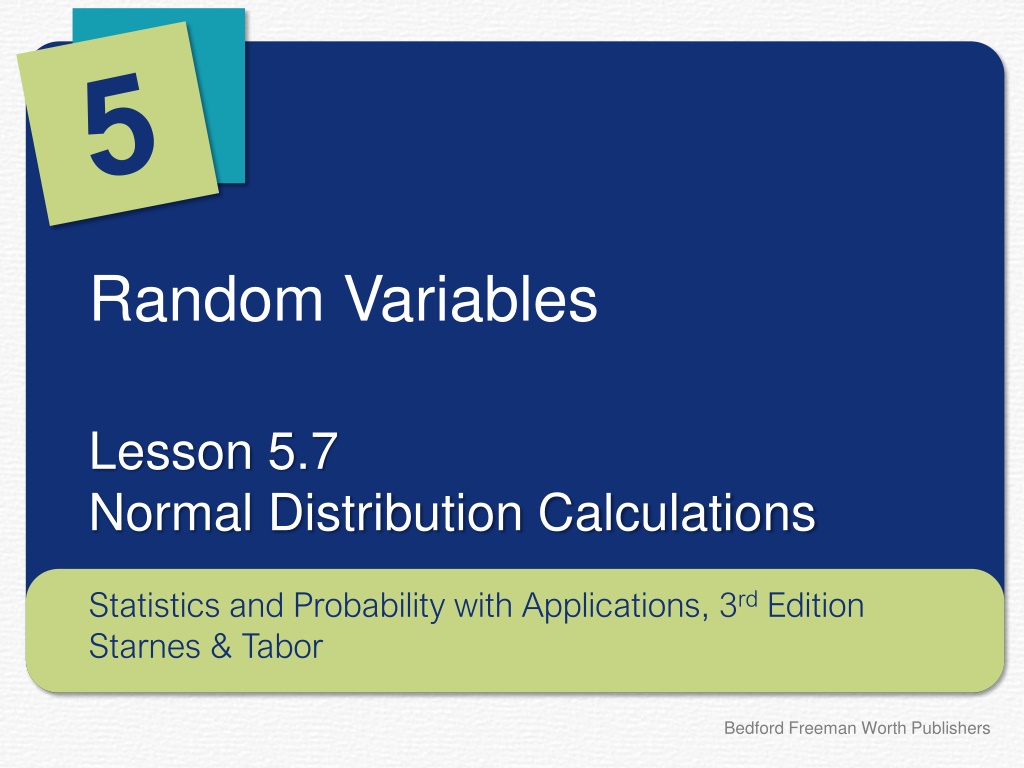 Random Variables Lesson 5.7 Normal Distribution Calculations Statistics and Probability with Applications, 3rdEdition Starnes & Tabor Bedford Freeman Worth Publishers