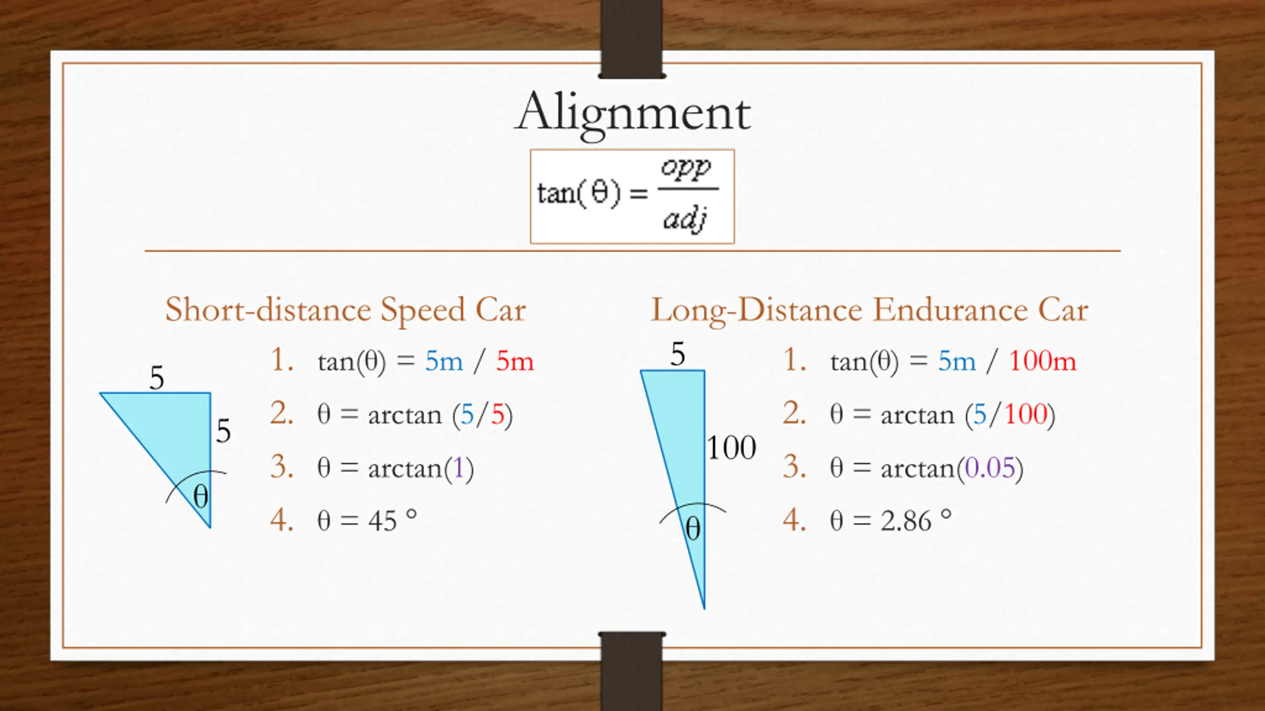 Alignment Short-distance Speed Car 1. tan( ) = 5m / 5m 2. = arctan (5/5) 3. = arctan(1) 4. = 45 Long-Distance Endurance Car 1. tan( ) = 5m / 100m 2. = arctan (5/100) 3. = arctan(0.05) 4. = 2.86 5 5 5 100