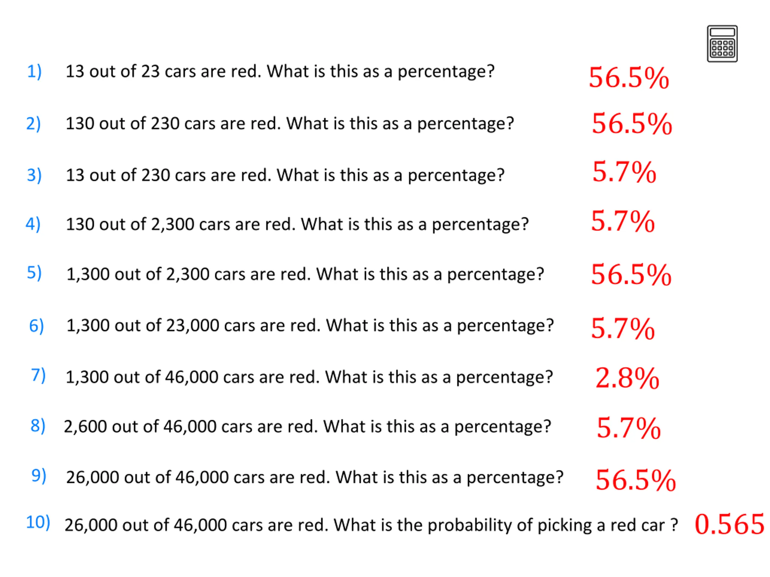 13 out of 23 cars are red. What is this as a percentage? 1) 56.5% 56.5% 130 out of 230 cars are red. What is this as a percentage? 2) 5.7% 3) 13 out of 230 cars are red. What is this as a percentage? 5.7% 4) 130 out of 2,300 cars are red. What is this as a percentage? 56.5% 5) 1,300 out of 2,300 cars are red. What is this as a percentage? 5.7% 1,300 out of 23,000 cars are red. What is this as a percentage? 6) 2.8% 7) 1,300 out of 46,000 cars are red. What is this as a percentage? 5.7% 8) 2,600 out of 46,000 cars are red. What is this as a percentage? 56.5% 9) 26,000 out of 46,000 cars are red. What is this as a percentage? 0.565 10) 26,000 out of 46,000 cars are red. What is the probability of picking a red car ?