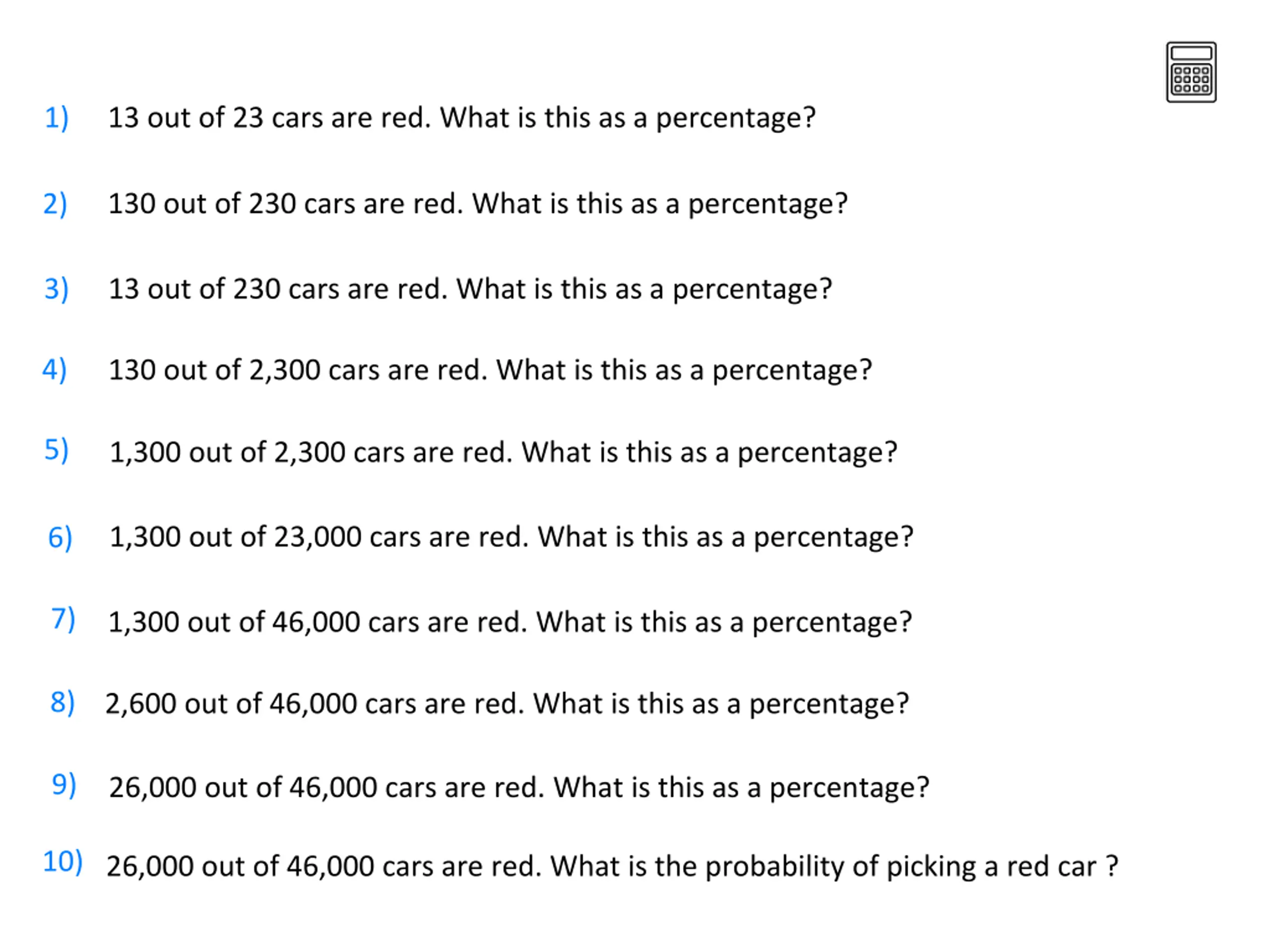 13 out of 23 cars are red. What is this as a percentage? 1) 130 out of 230 cars are red. What is this as a percentage? 2) 3) 13 out of 230 cars are red. What is this as a percentage? 4) 130 out of 2,300 cars are red. What is this as a percentage? 5) 1,300 out of 2,300 cars are red. What is this as a percentage? 1,300 out of 23,000 cars are red. What is this as a percentage? 6) 7) 1,300 out of 46,000 cars are red. What is this as a percentage? 8) 2,600 out of 46,000 cars are red. What is this as a percentage? 9) 26,000 out of 46,000 cars are red. What is this as a percentage? 10) 26,000 out of 46,000 cars are red. What is the probability of picking a red car ?