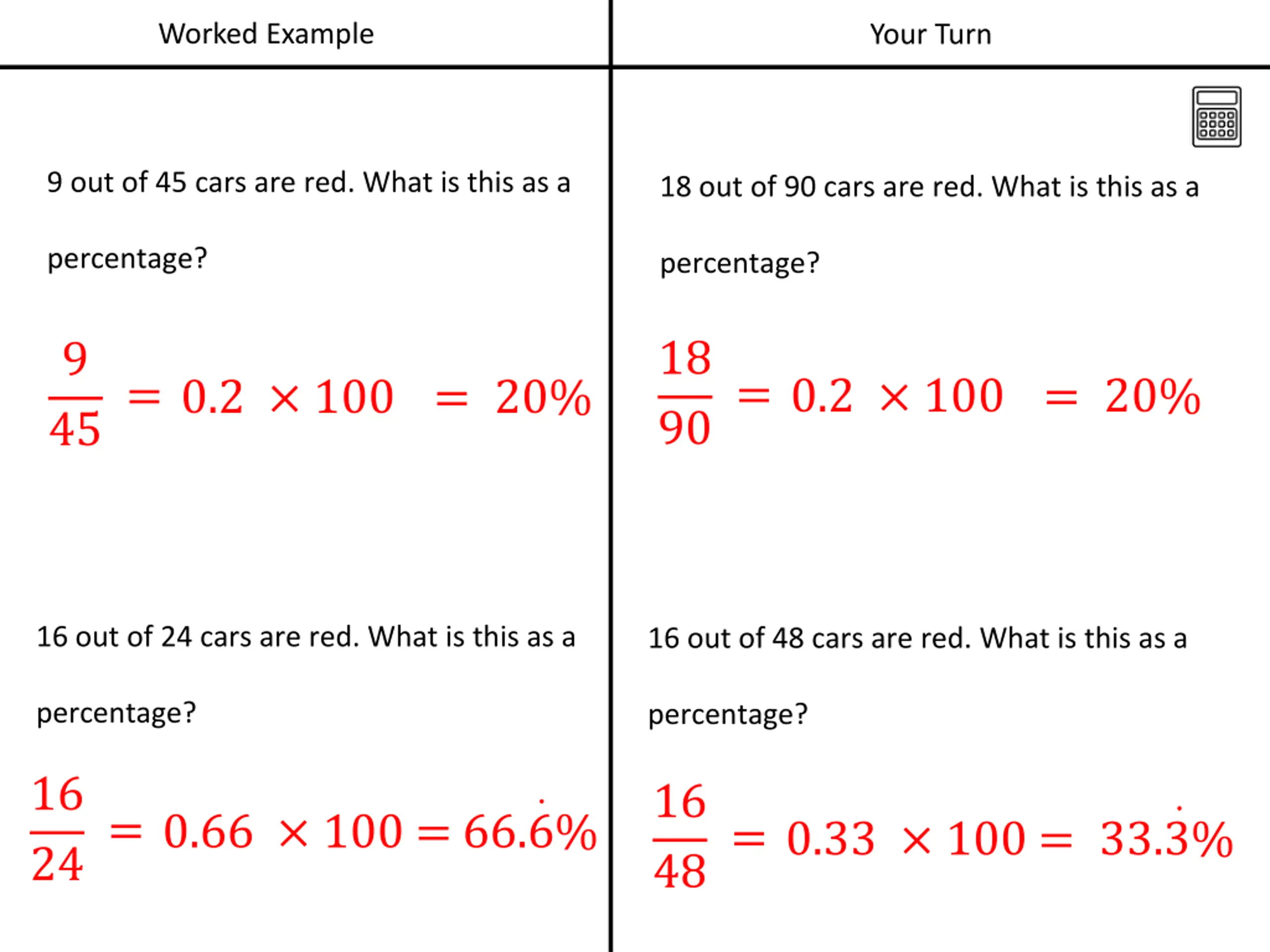 Expressing numbers as a Expressing numbers as a percentage (Calculator) percentage (Calculator) Silent Teacher Intelligent Practice Your Turn Narration 16 out of 48 cars are red. What is this as a percentage? Practice