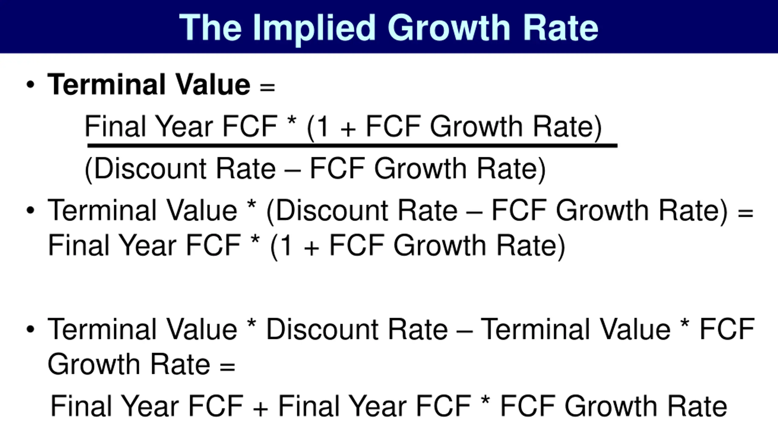 The Implied Growth Rate Terminal Value = Final Year FCF * (1 + FCF Growth Rate) (Discount Rate FCF Growth Rate) Terminal Value * (Discount Rate FCF Growth Rate) = Final Year FCF * (1 + FCF Growth Rate) Terminal Value * Discount Rate Terminal Value * FCF Growth Rate = Final Year FCF + Final Year FCF * FCF Growth Rate