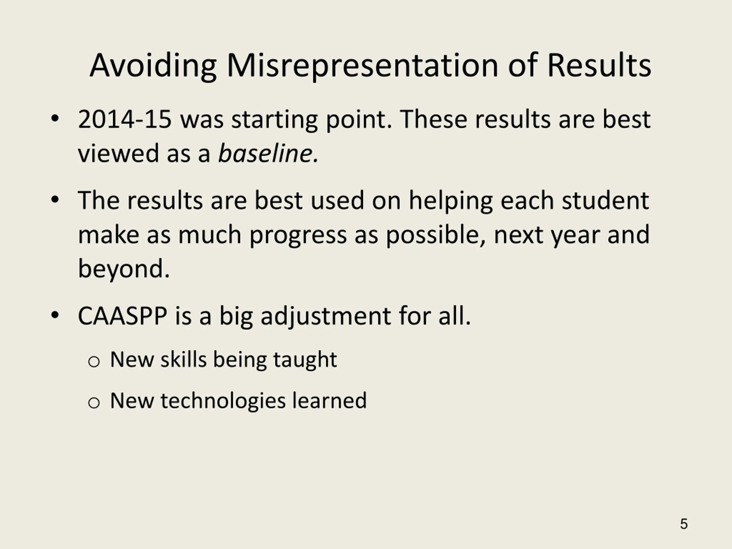 Avoiding Misrepresentation of Results 2014-15 was starting point. These results are best viewed as a baseline. The results are best used on helping each student make as much progress as possible, next year and beyond. CAASPP is a big adjustment for all. o New skills being taught o New technologies learned 5