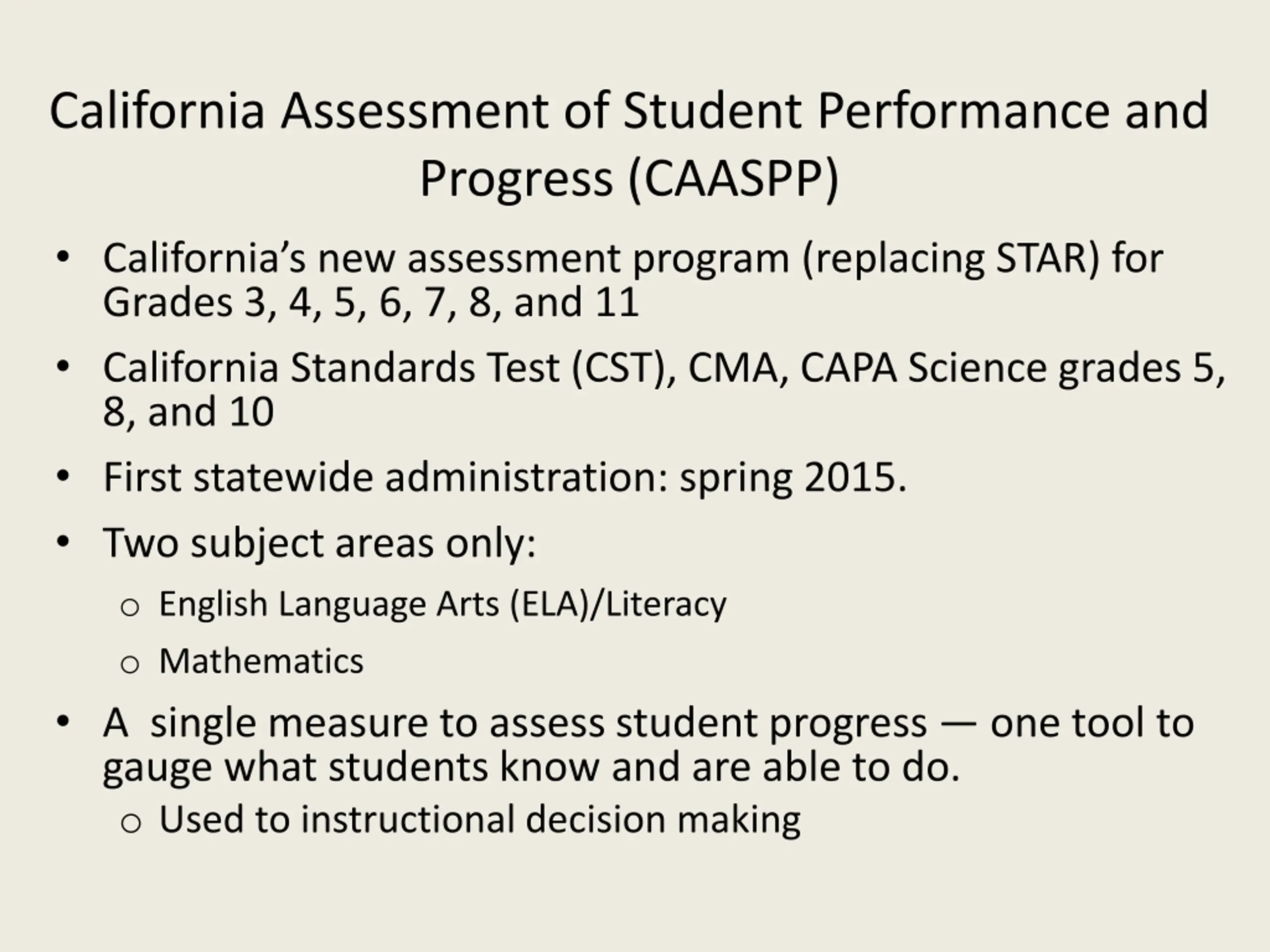 California Assessment of Student Performance and Progress (CAASPP) California s new assessment program (replacing STAR) for Grades 3, 4, 5, 6, 7, 8, and 11 California Standards Test (CST), CMA, CAPA Science grades 5, 8, and 10 First statewide administration: spring 2015. Two subject areas only: o English Language Arts (ELA)/Literacy o Mathematics A single measure to assess student progress one tool to gauge what students know and are able to do. o Used to instructional decision making