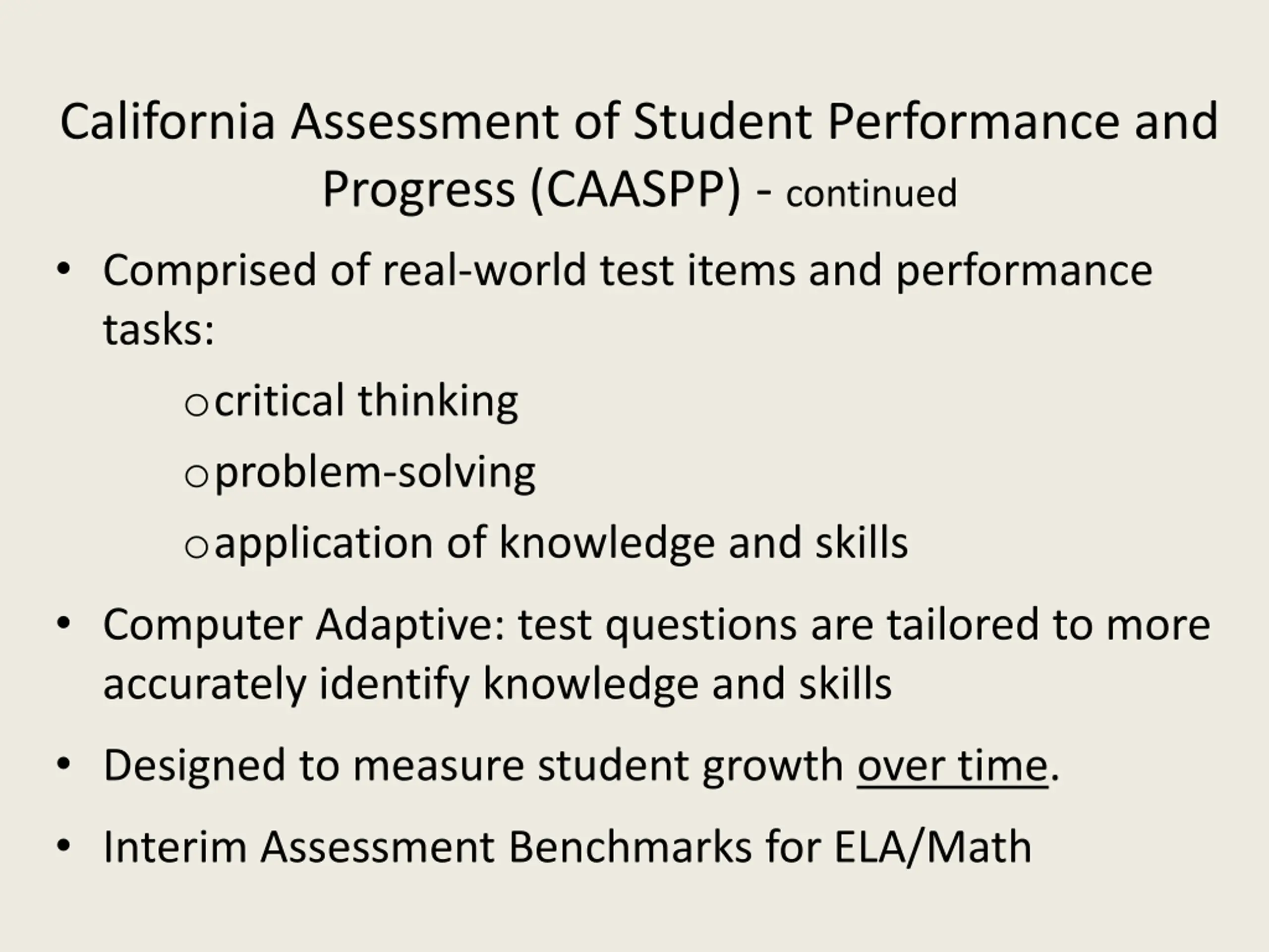 California Assessment of Student Performance and Progress (CAASPP) - continued Comprised of real-world test items and performance tasks: ocritical thinking oproblem-solving oapplication of knowledge and skills Computer Adaptive: test questions are tailored to more accurately identify knowledge and skills Designed to measure student growth over time. Interim Assessment Benchmarks for ELA/Math