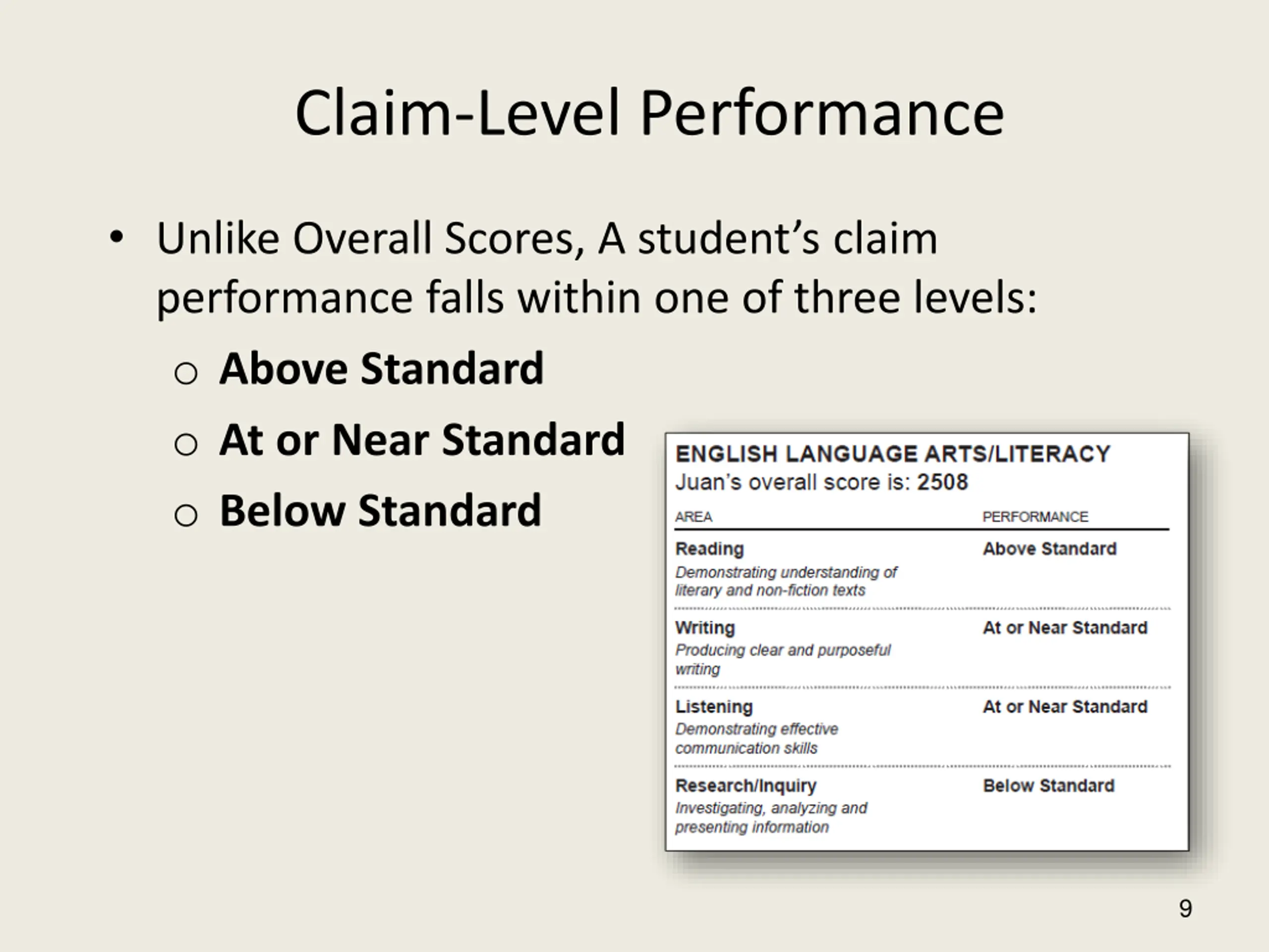 Claim-Level Performance Unlike Overall Scores, A student s claim performance falls within one of three levels: o Above Standard o At or Near Standard o Below Standard 9