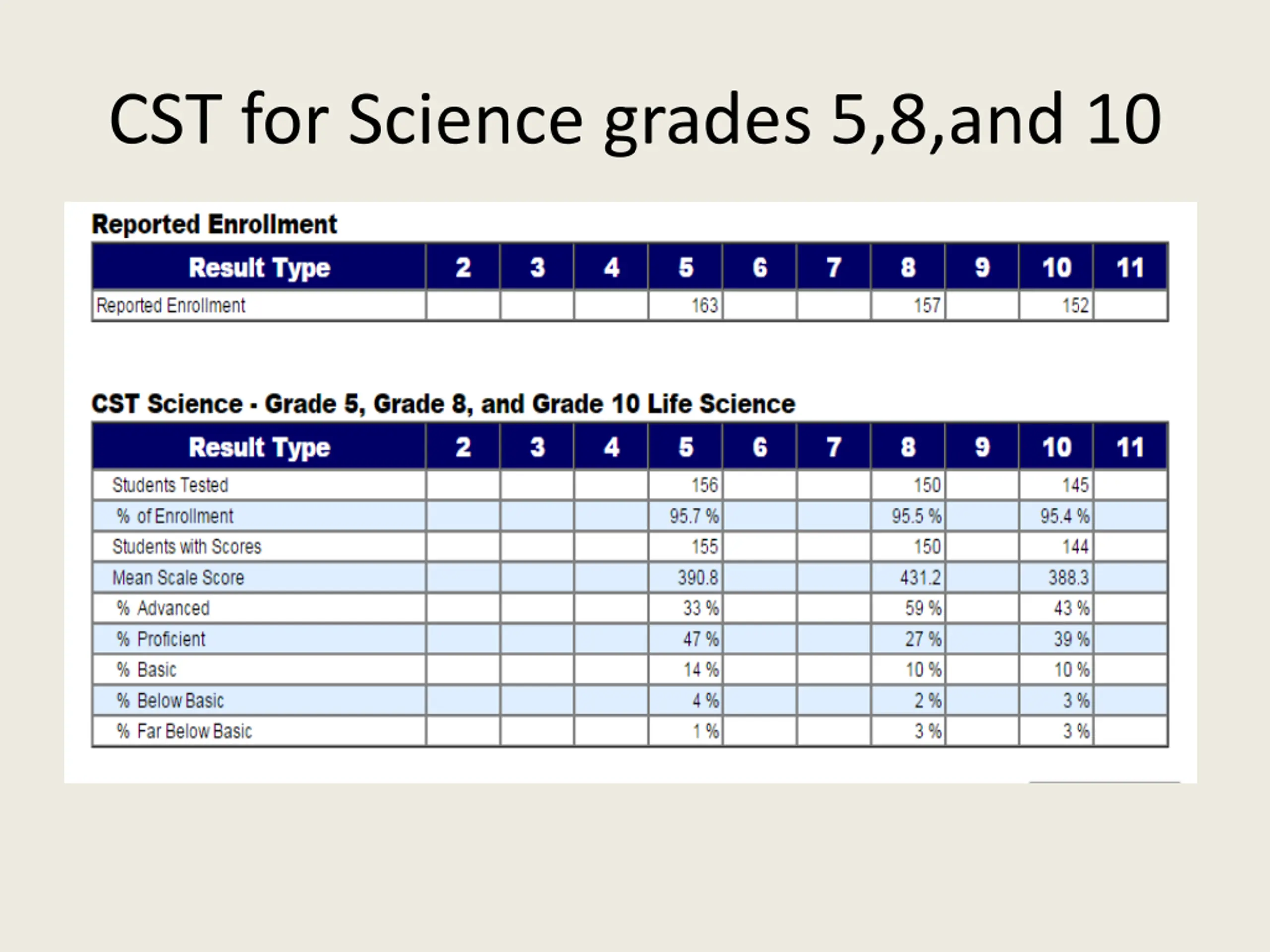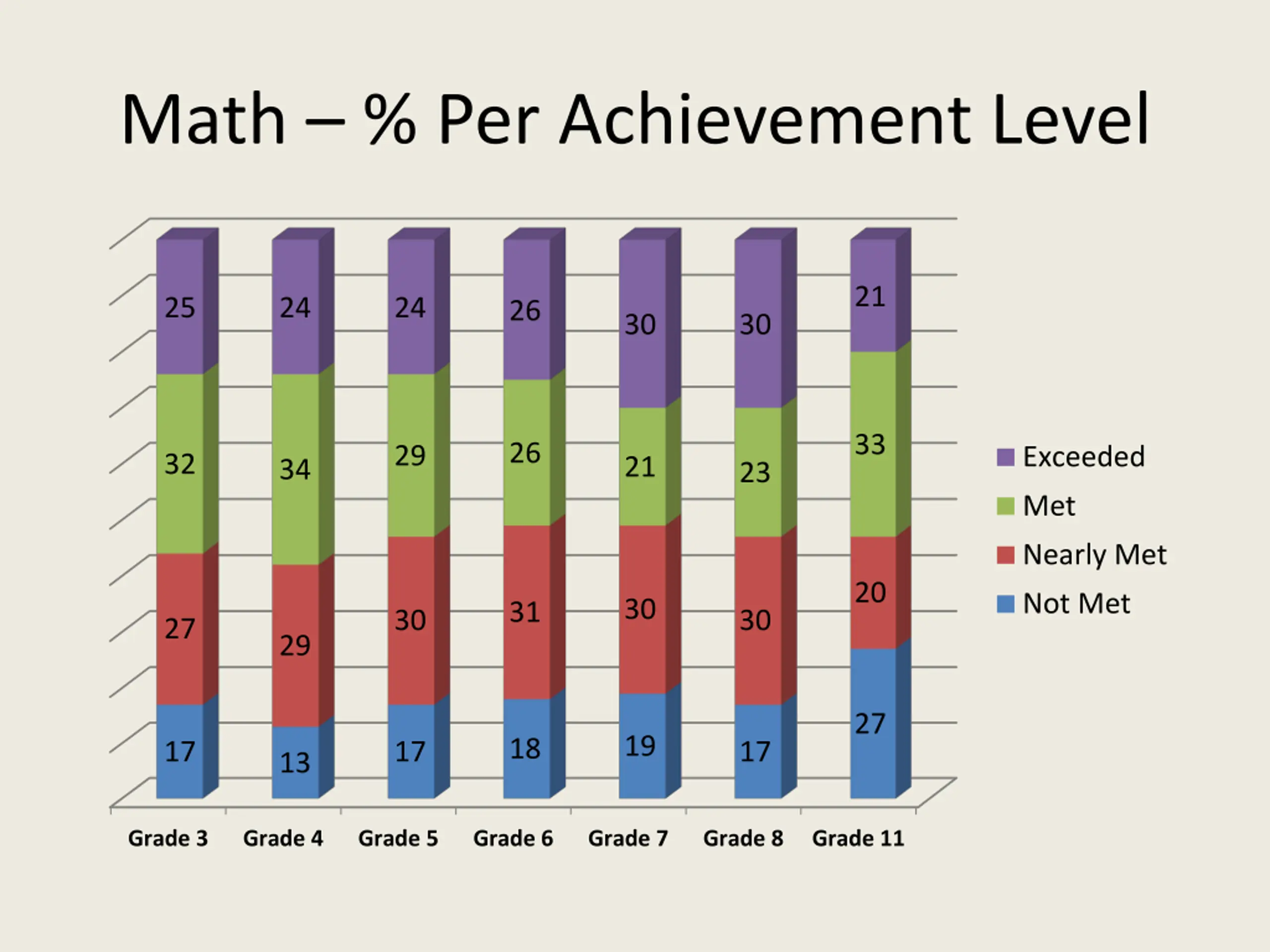 Math % Per Achievement Level 21 25 24 24 26 30 30 33 26 29 Exceeded 32 21 34 23 Met Nearly Met 20 Not Met 30 31 30 30 27 29 27 19 18 17 17 17 13 Grade 3 Grade 4 Grade 5 Grade 6 Grade 7 Grade 8 Grade 11