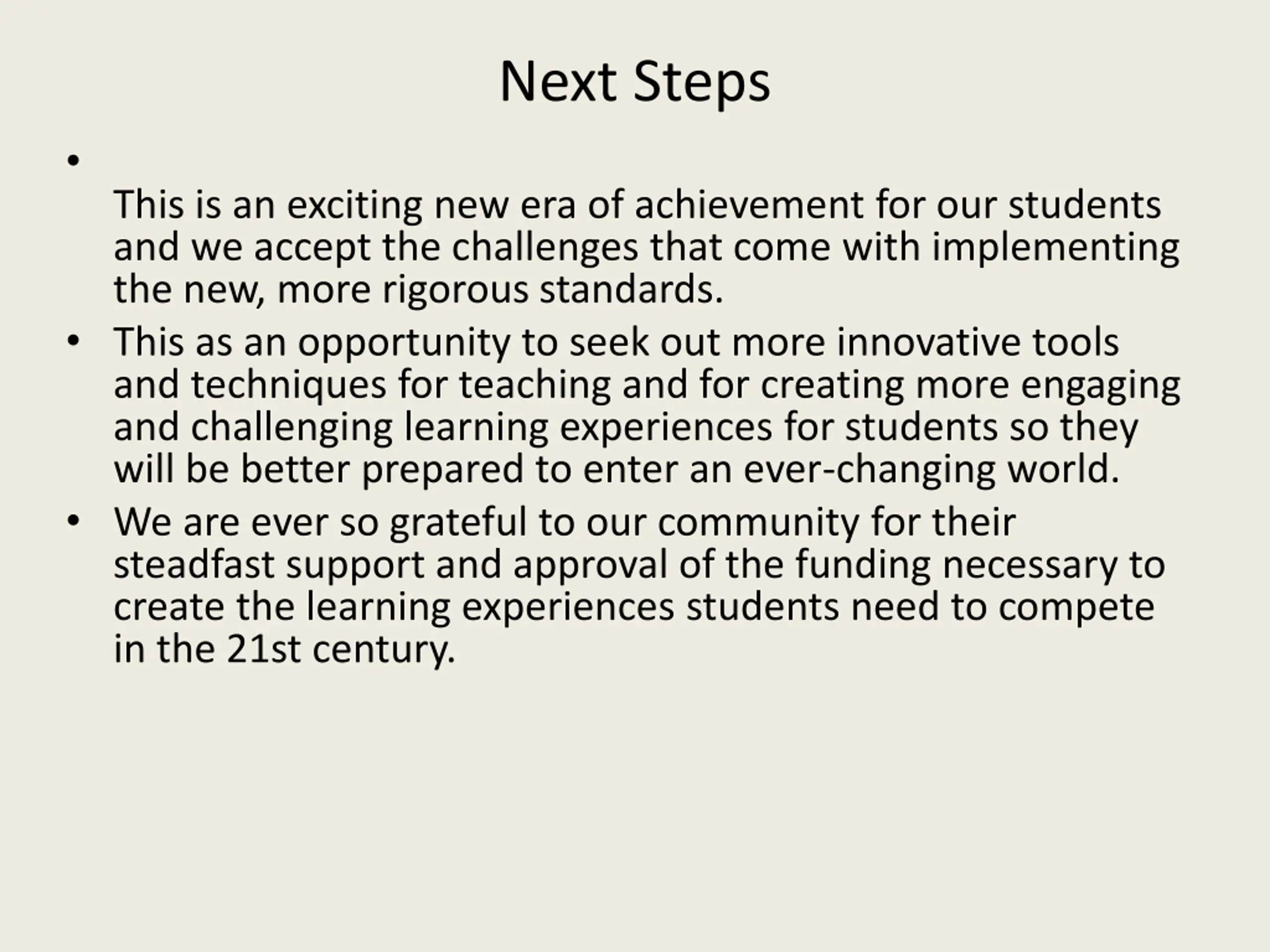 Next Steps This is an exciting new era of achievement for our students and we accept the challenges that come with implementing the new, more rigorous standards. This as an opportunity to seek out more innovative tools and techniques for teaching and for creating more engaging and challenging learning experiences for students so they will be better prepared to enter an ever-changing world. We are ever so grateful to our community for their steadfast support and approval of the funding necessary to create the learning experiences students need to compete in the 21st century.