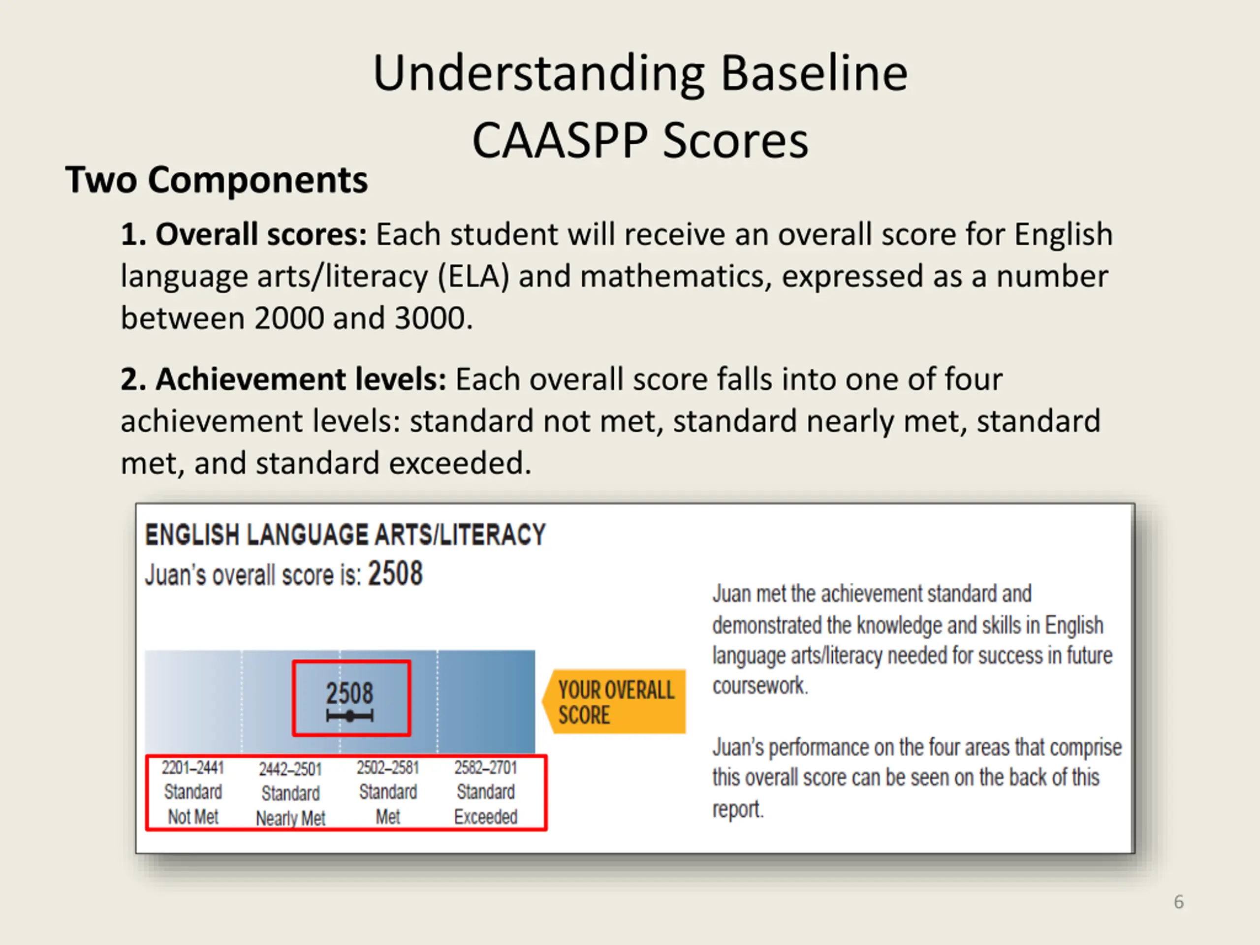 Understanding Baseline CAASPP Scores Two Components 1. Overall scores: Each student will receive an overall score for English language arts/literacy (ELA) and mathematics, expressed as a number between 2000 and 3000. 2. Achievement levels: Each overall score falls into one of four achievement levels: standard not met, standard nearly met, standard met, and standard exceeded. 6