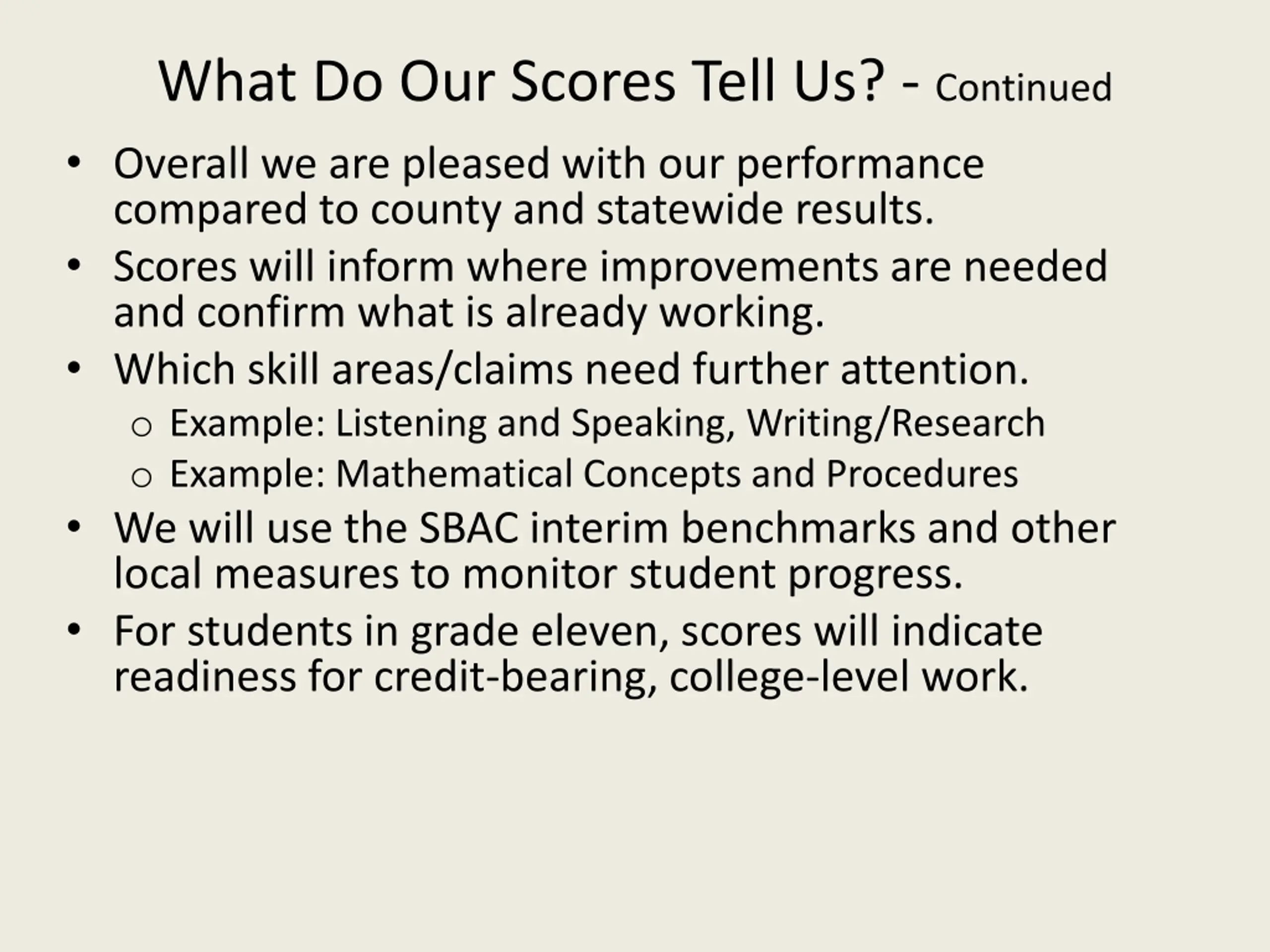What Do Our Scores Tell Us? - Continued Overall we are pleased with our performance compared to county and statewide results. Scores will inform where improvements are needed and confirm what is already working. Which skill areas/claims need further attention. o Example: Listening and Speaking, Writing/Research o Example: Mathematical Concepts and Procedures We will use the SBAC interim benchmarks and other local measures to monitor student progress. For students in grade eleven, scores will indicate readiness for credit-bearing, college-level work.