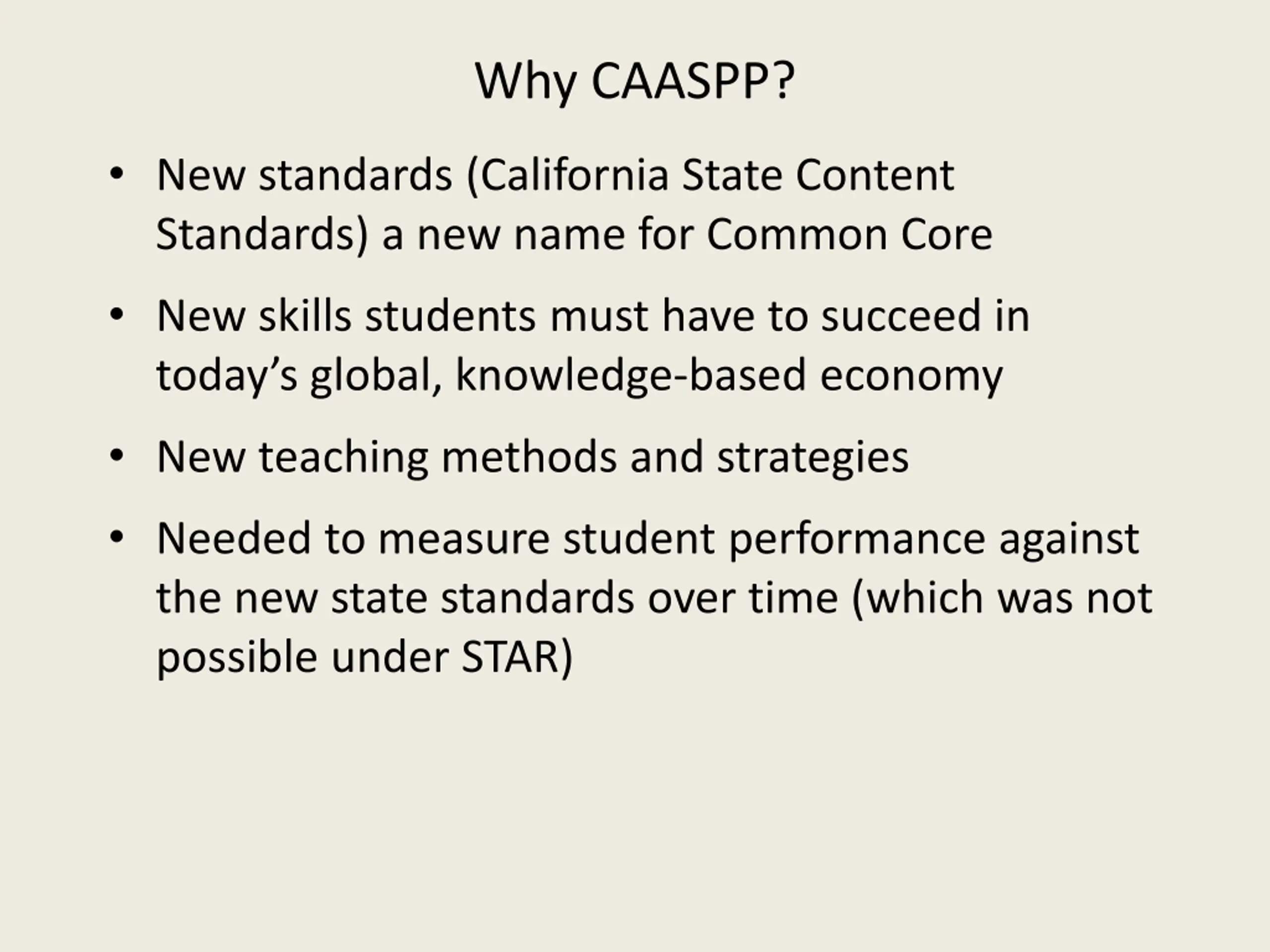 Why CAASPP? New standards (California State Content Standards) a new name for Common Core New skills students must have to succeed in today s global, knowledge-based economy New teaching methods and strategies Needed to measure student performance against the new state standards over time (which was not possible under STAR)