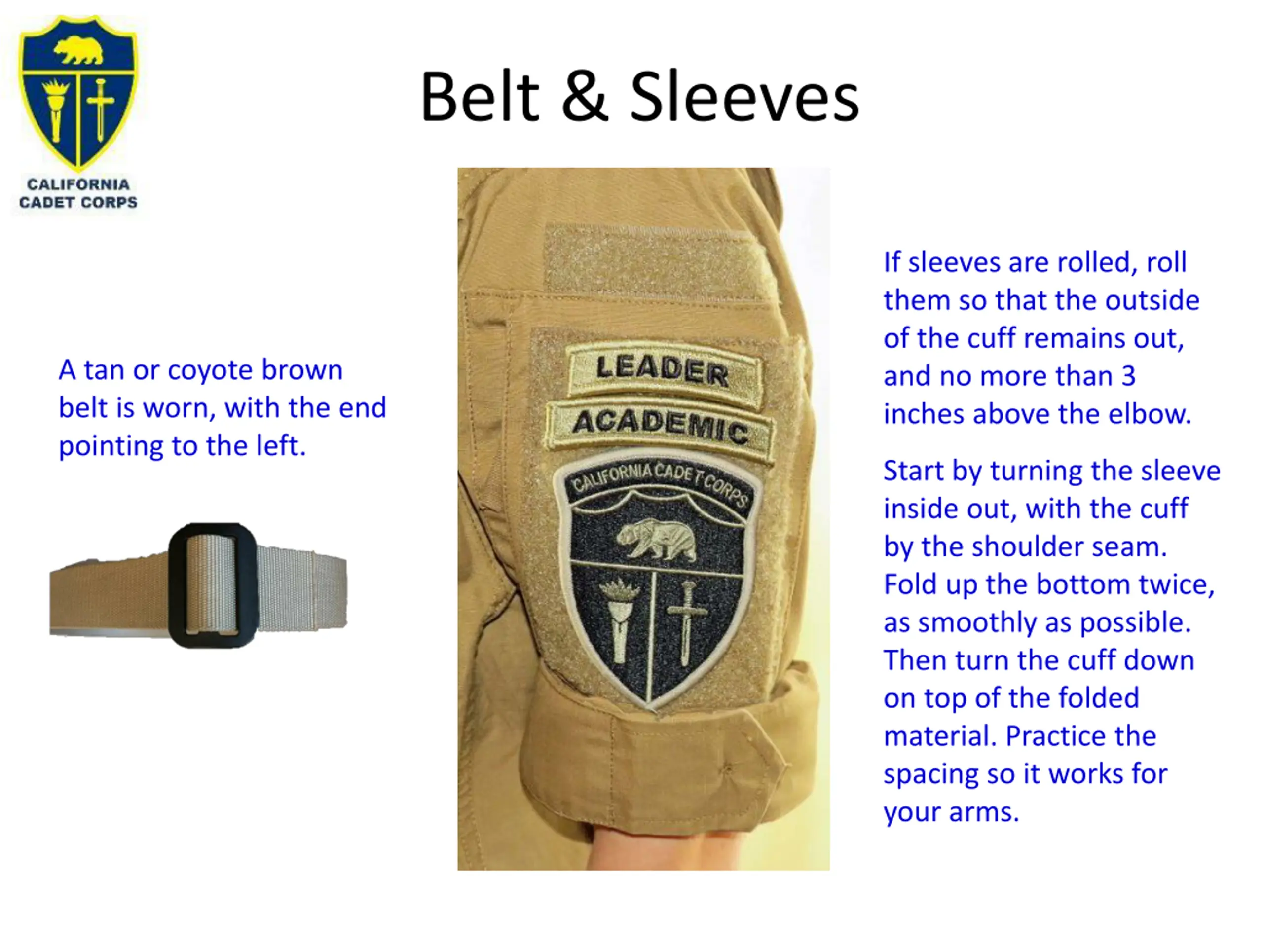 Belt & Sleeves If sleeves are rolled, roll them so that the outside of the cuff remains out, and no more than 3 inches above the elbow. A tan or coyote brown belt is worn, with the end pointing to the left. Start by turning the sleeve inside out, with the cuff by the shoulder seam. Fold up the bottom twice, as smoothly as possible. Then turn the cuff down on top of the folded material. Practice the spacing so it works for your arms.
