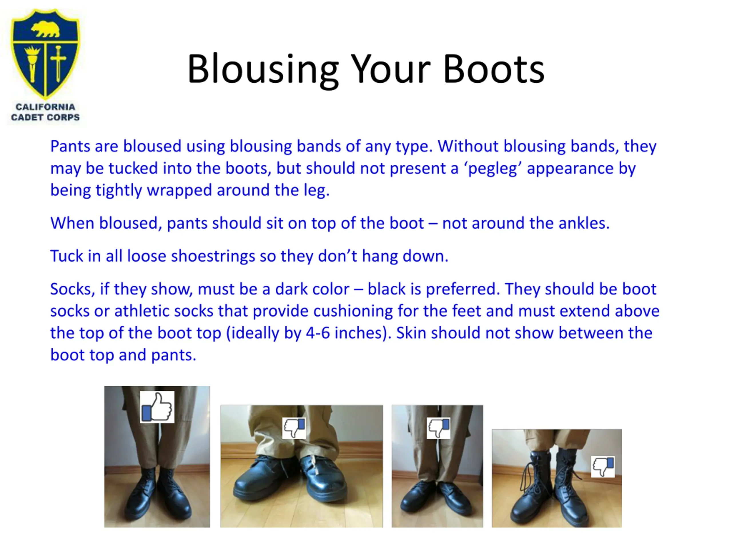 Blousing Your Boots Pants are bloused using blousing bands of any type. Without blousing bands, they may be tucked into the boots, but should not present a pegleg appearance by being tightly wrapped around the leg. When bloused, pants should sit on top of the boot not around the ankles. Tuck in all loose shoestrings so they don t hang down. Socks, if they show, must be a dark color black is preferred. They should be boot socks or athletic socks that provide cushioning for the feet and must extend above the top of the boot top (ideally by 4-6 inches). Skin should not show between the boot top and pants.