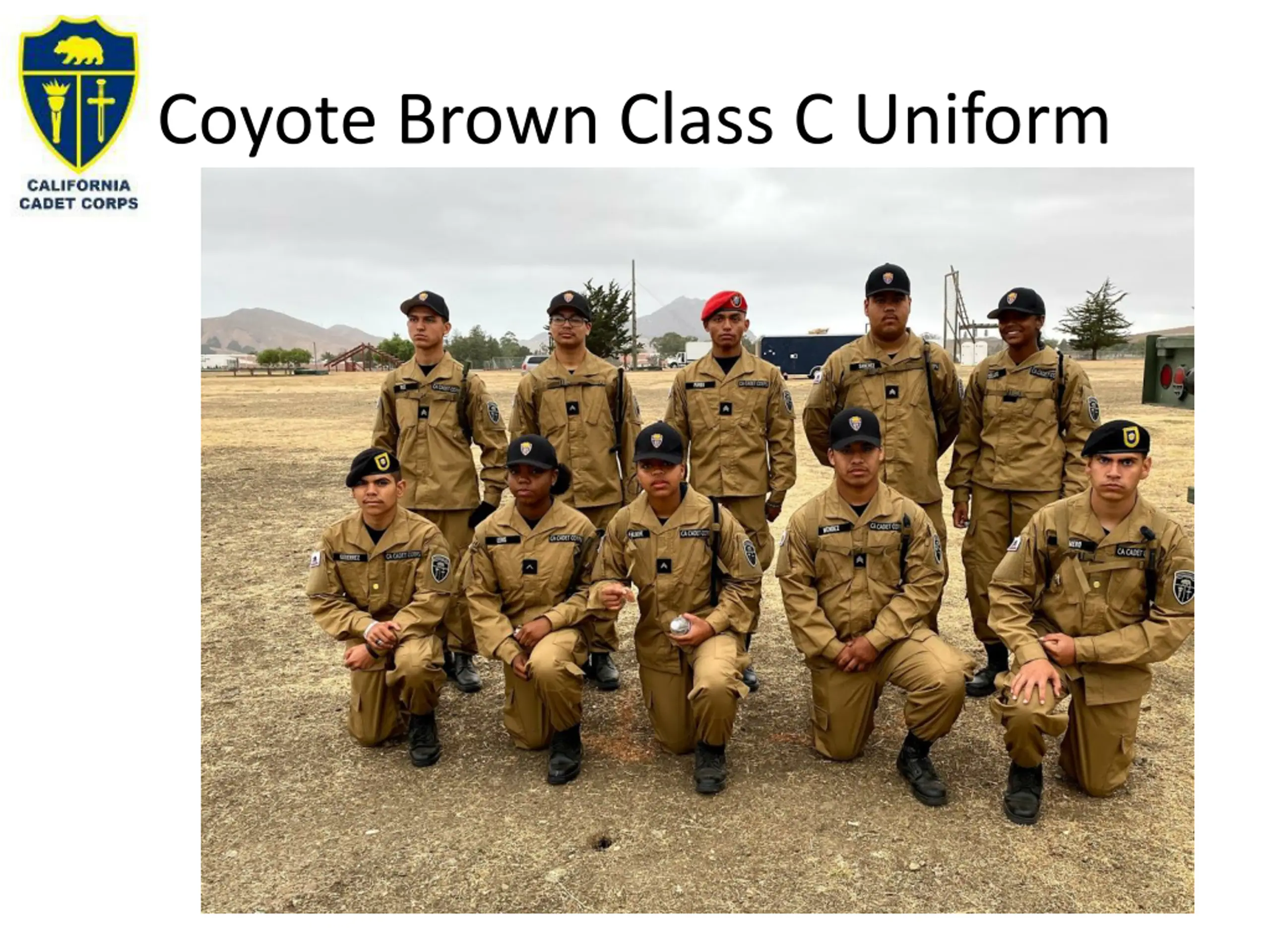 COYOTE BROWN CLASS C UNIFORM OBJECTIVES DESIRED OUTCOME (Followership) 90% of Cadets will understand when the Class C Uniform is appropriate for wear, will be able to wear it properly, and describe the standards for each of the parts of the uniform. Plan of Action: 1. Wear the Coyote Brown Class C Uniform to standard. 2. Wear the Khaki Class C Uniform to standard Essential Question: What are the standards for wearing the Class C Uniform properly? What are all the parts to it?