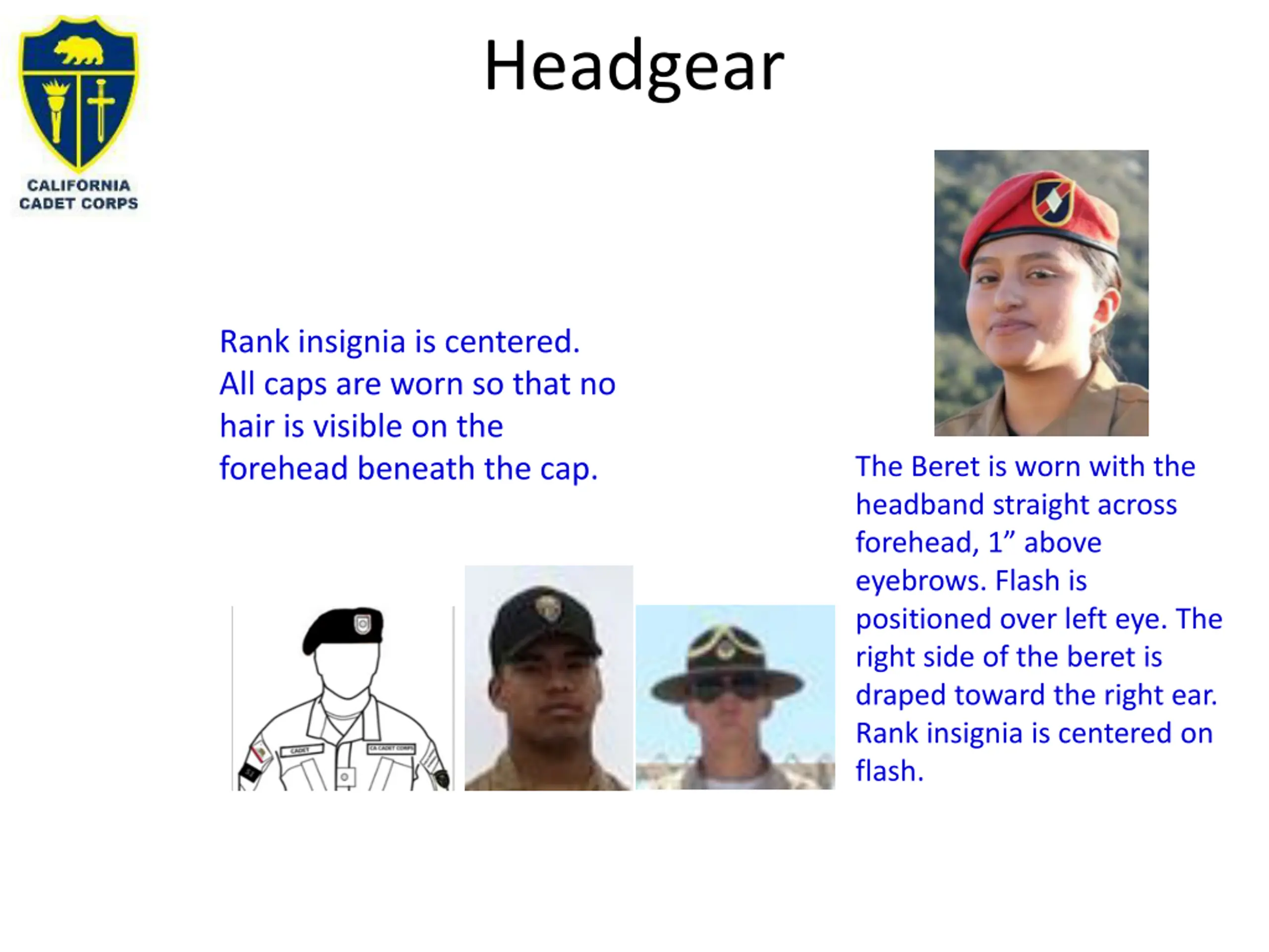 Headgear Rank insignia is centered. All caps are worn so that no hair is visible on the forehead beneath the cap. The Beret is worn with the headband straight across forehead, 1 above eyebrows. Flash is positioned over left eye. The right side of the beret is draped toward the right ear. Rank insignia is centered on flash.