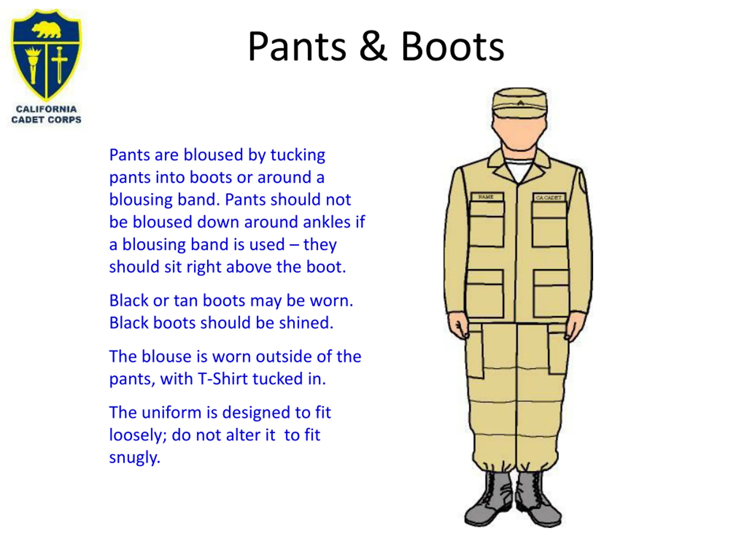Pants & Boots Pants are bloused by tucking pants into boots or around a blousing band. Pants should not be bloused down around ankles if a blousing band is used they should sit right above the boot. Black or tan boots may be worn. Black boots should be shined. The blouse is worn outside of the pants, with T-Shirt tucked in. The uniform is designed to fit loosely; do not alter it to fit snugly.