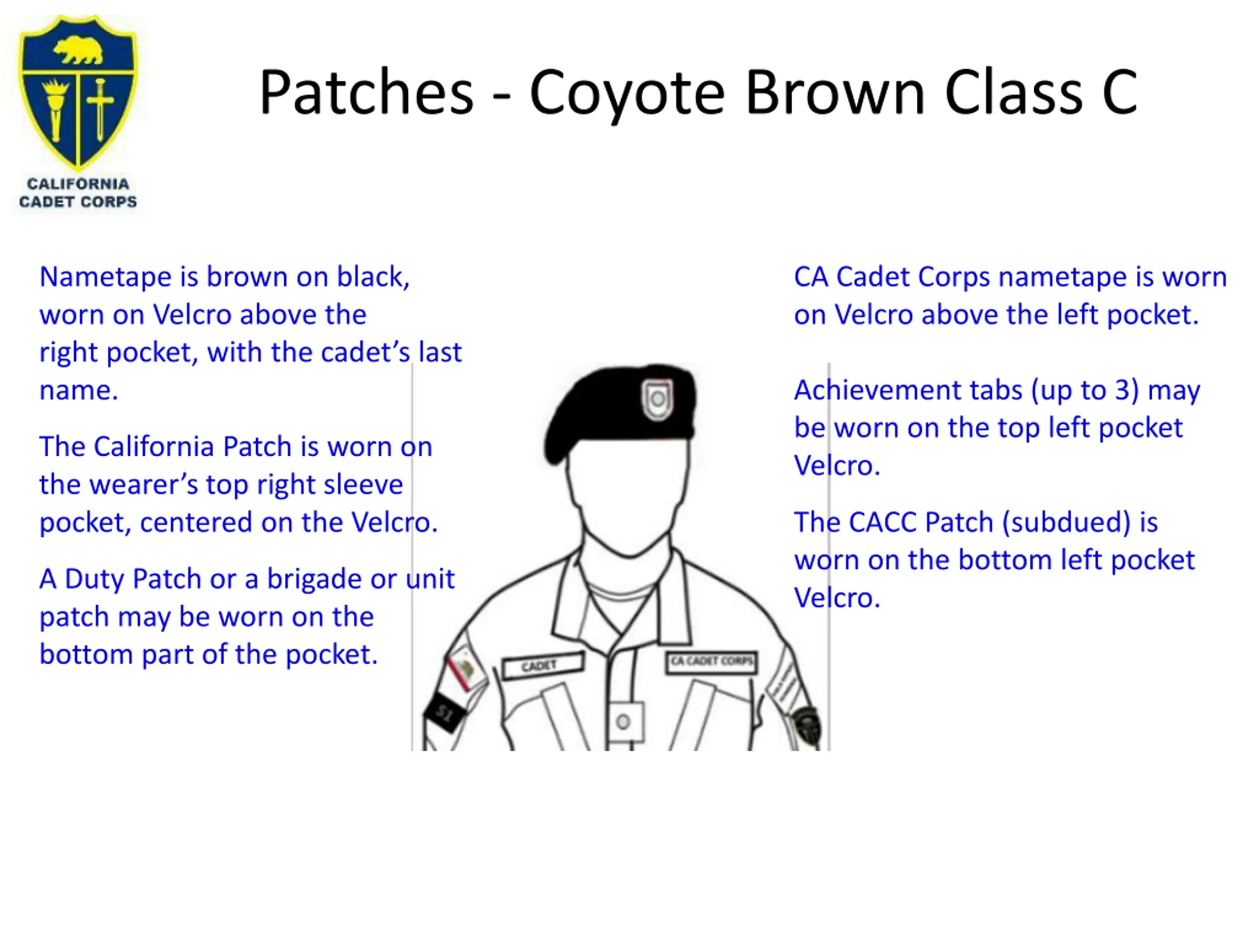 Patches - Coyote Brown Class C Nametape is brown on black, worn on Velcro above the right pocket, with the cadet s last name. CA Cadet Corps nametape is worn on Velcro above the left pocket. Achievement tabs (up to 3) may be worn on the top left pocket Velcro. The California Patch is worn on the wearer s top right sleeve pocket, centered on the Velcro. The CACC Patch (subdued) is worn on the bottom left pocket Velcro. A Duty Patch or a brigade or unit patch may be worn on the bottom part of the pocket.