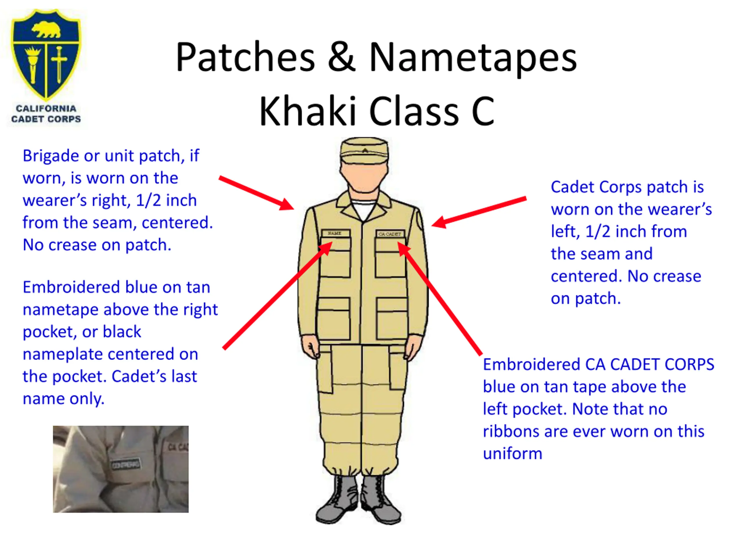Patches & Nametapes Khaki Class C Brigade or unit patch, if worn, is worn on the wearer s right, 1/2 inch from the seam, centered. No crease on patch. Cadet Corps patch is worn on the wearer s left, 1/2 inch from the seam and centered. No crease on patch. Embroidered blue on tan nametape above the right pocket, or black nameplate centered on the pocket. Cadet s last name only. Embroidered CA CADET CORPS blue on tan tape above the left pocket. Note that no ribbons are ever worn on this uniform