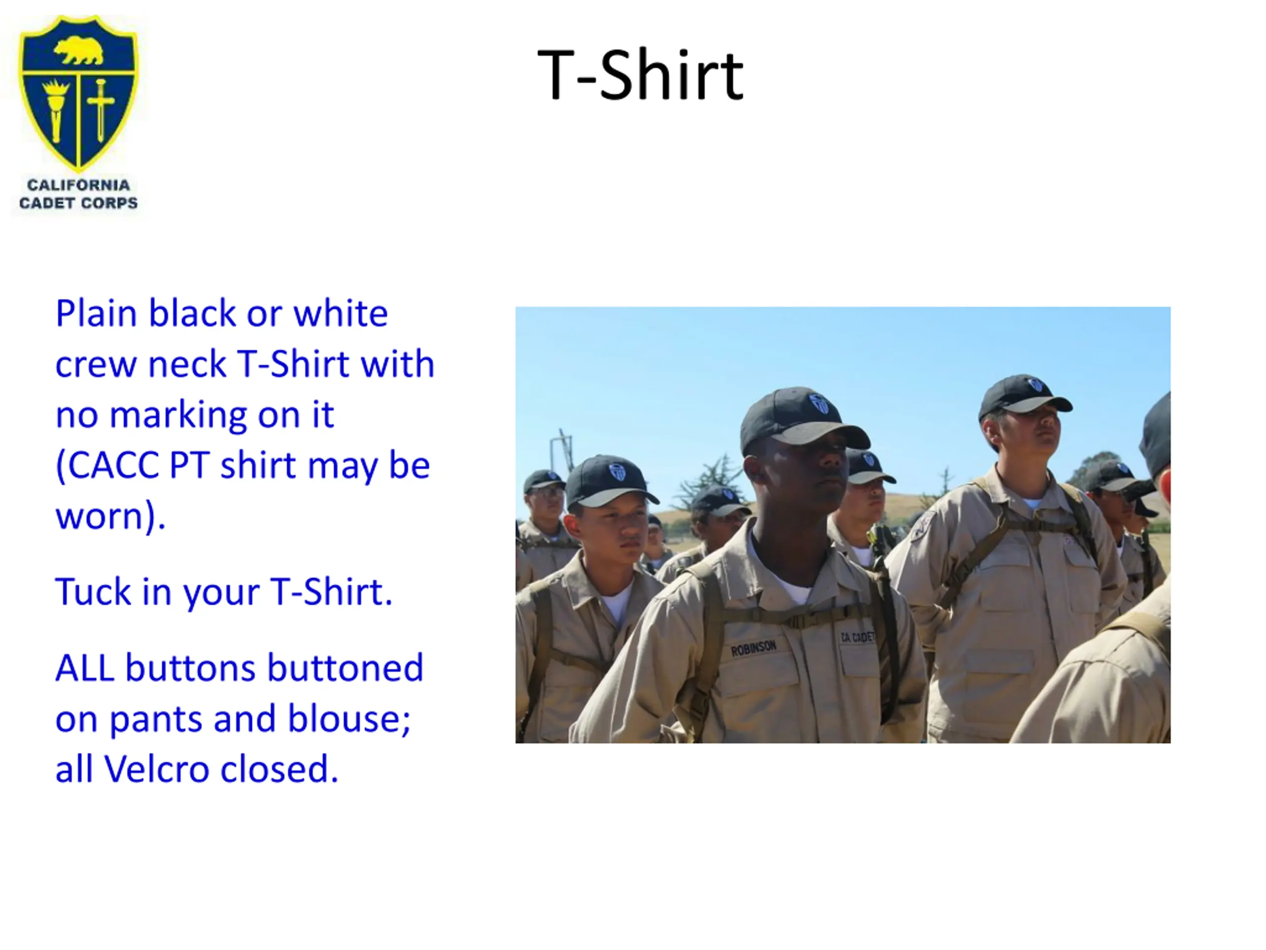 T-Shirt Plain black or white crew neck T-Shirt with no marking on it (CACC PT shirt may be worn). Tuck in your T-Shirt. ALL buttons buttoned on pants and blouse; all Velcro closed.