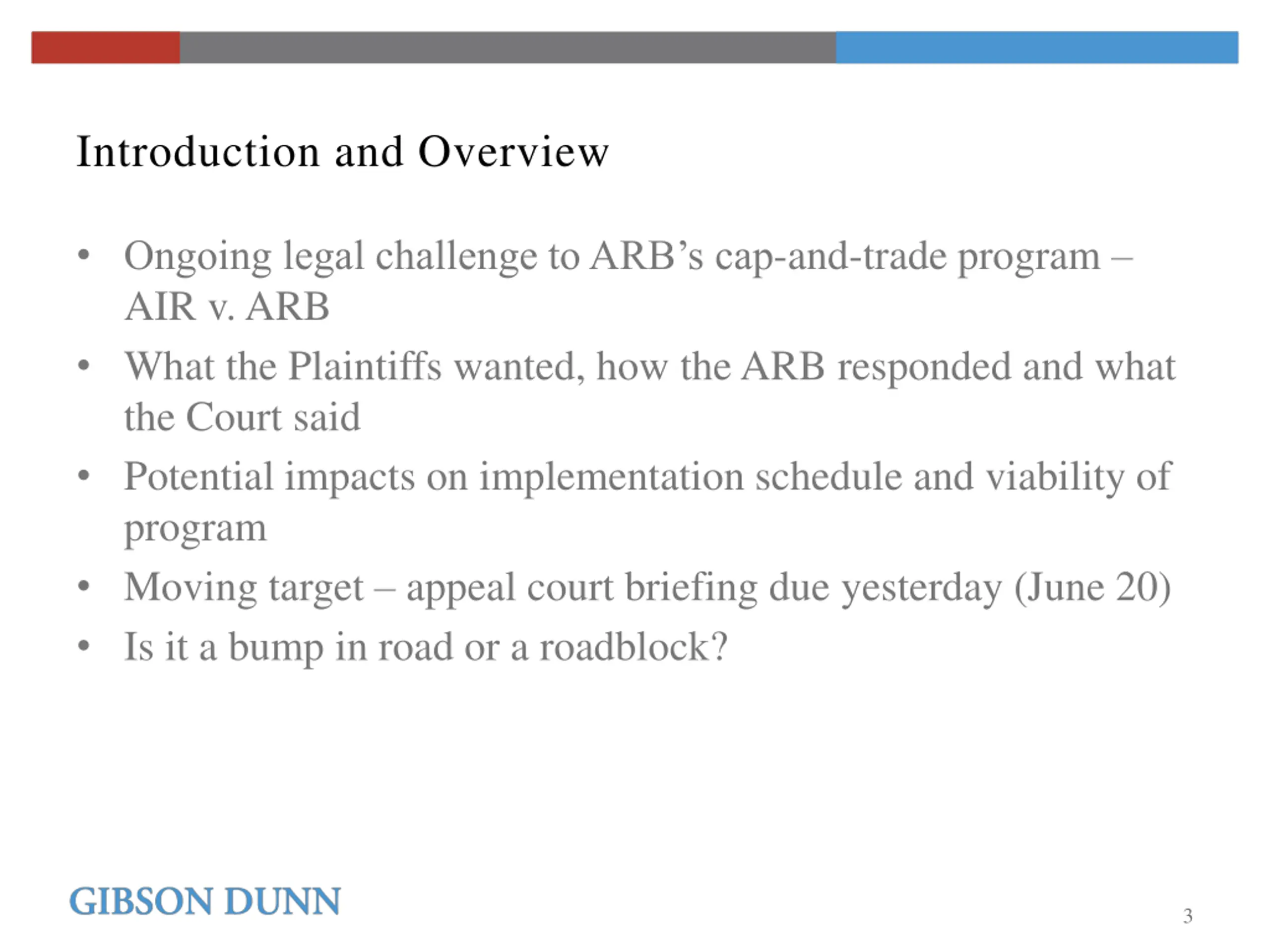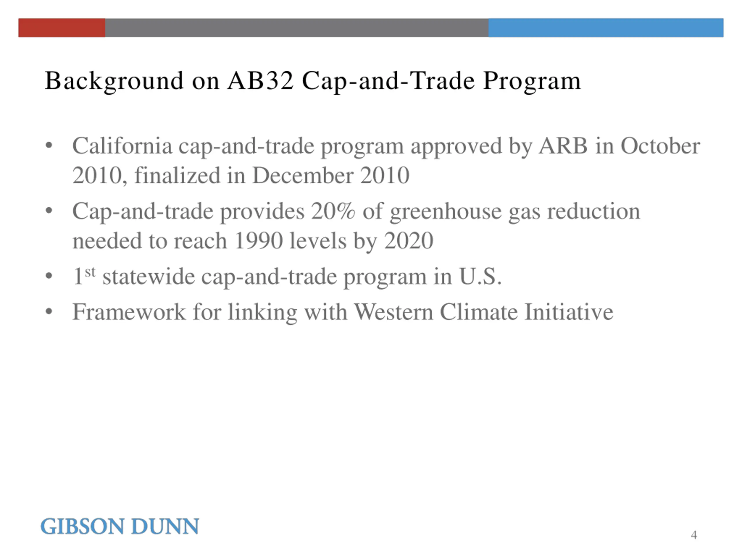 <Presentation Title/Client Name> Introduction and Overview Ongoing legal challenge to ARB s cap-and-trade program AIR v. ARB What the Plaintiffs wanted, how the ARB responded and what the Court said Potential impacts on implementation schedule and viability of program Moving target appeal court briefing due yesterday (June 20) Is it a bump in road or a roadblock? 3